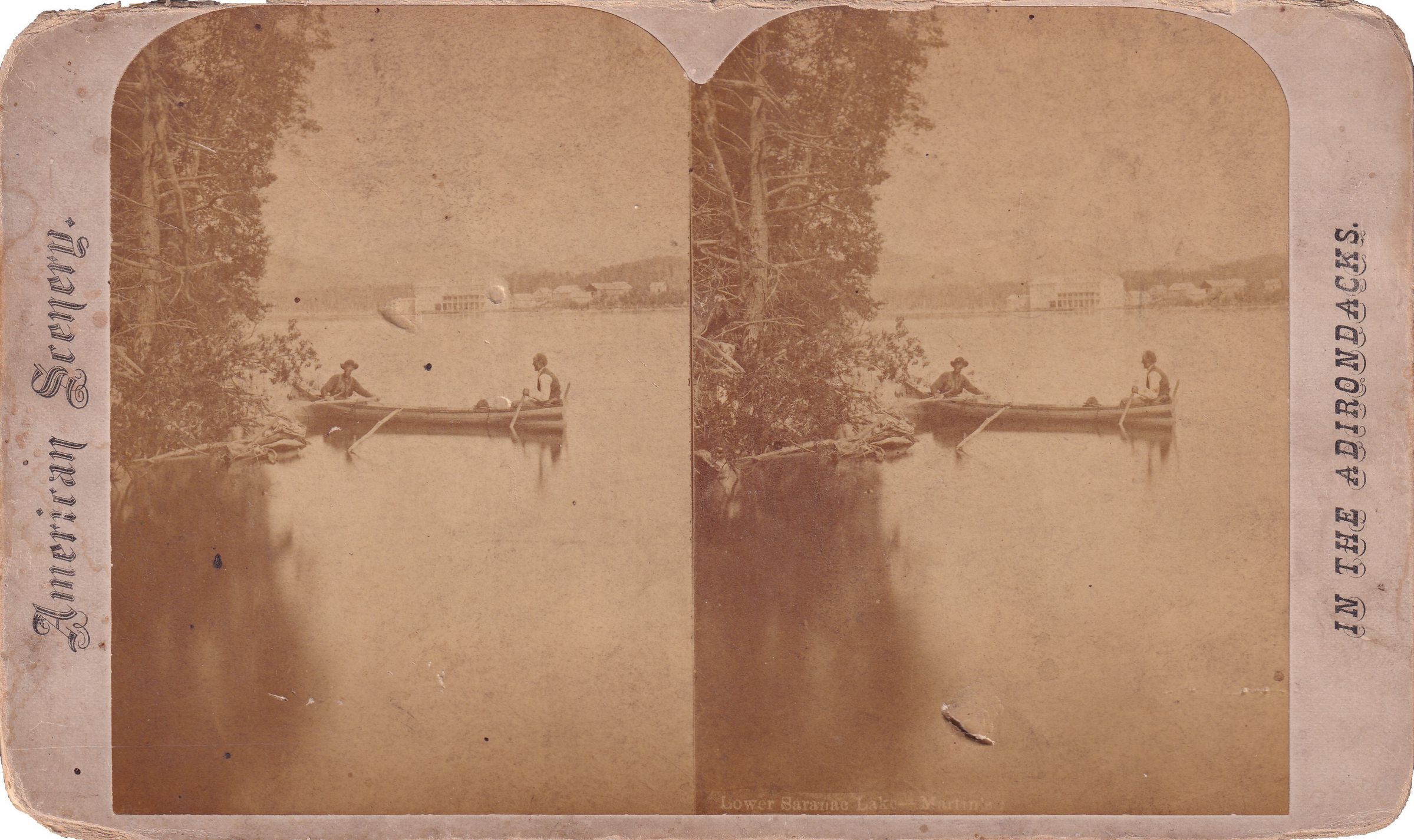 Stereoview photograph showing two guides in a guideboat on Lower Saranac Lake. Martin's is visible on the shore in the distance. Printed caption on image reads, "Lower Saranac Lake, Martin's." Mounted on cardboard backing with "American Scenery" and "In the Adirondacks," printed on the edges.
