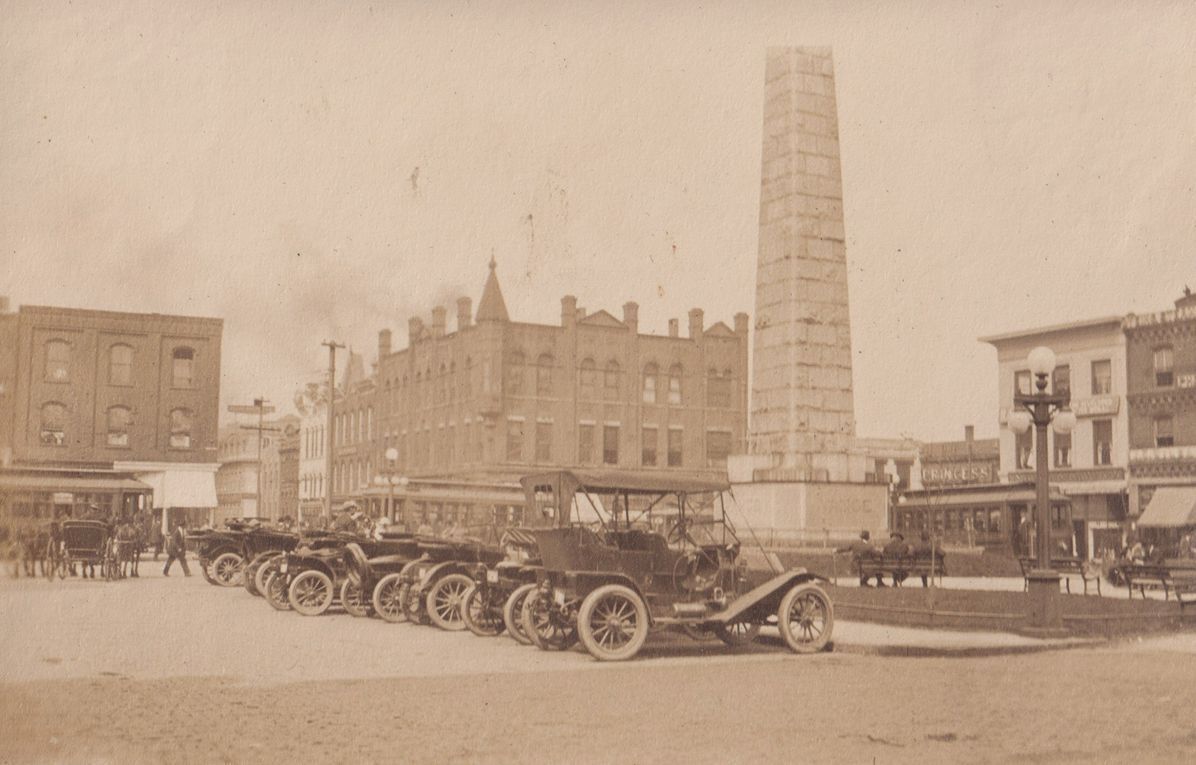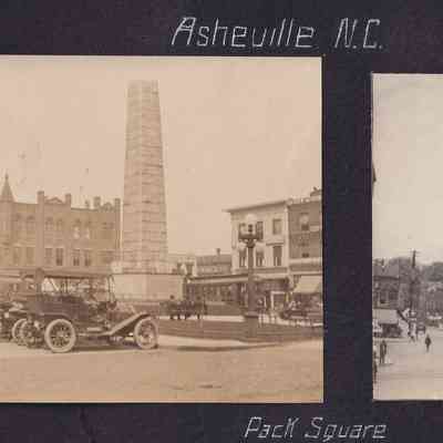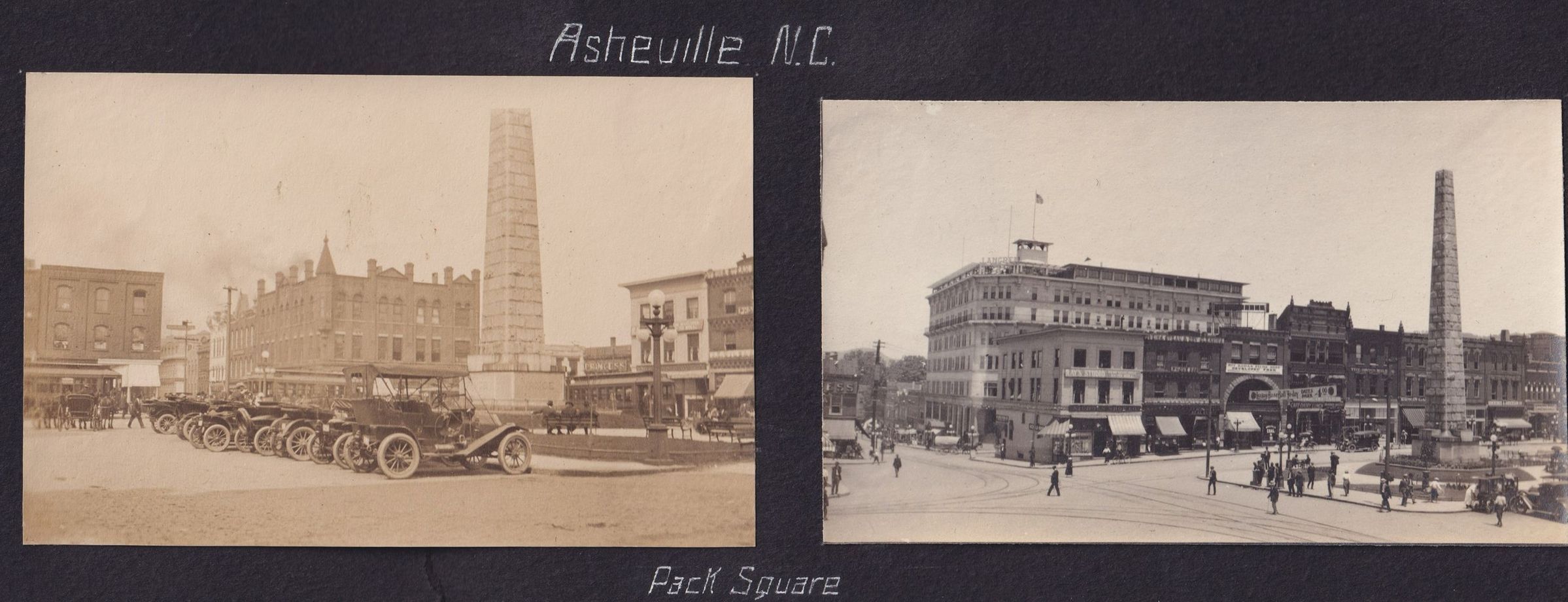Black-and-white photograph of Pack Square in Asheville, North Carolina with many cars parked along a sidewalk. On the other side of the cars there are some men sitting on a bench and a stone tower. "Asheville, N.C." is written above the photo and "Pack Square" below it, both in white ink.