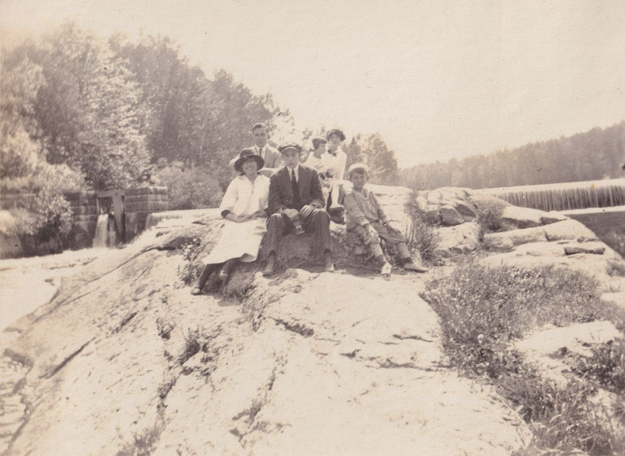 Black-and-white photograph of a group of people, two women, two men, one boy and one girl, sitting on a rock on the shore of a river. The flowing water is visible behind them, as well as lots of trees growing along the shore.