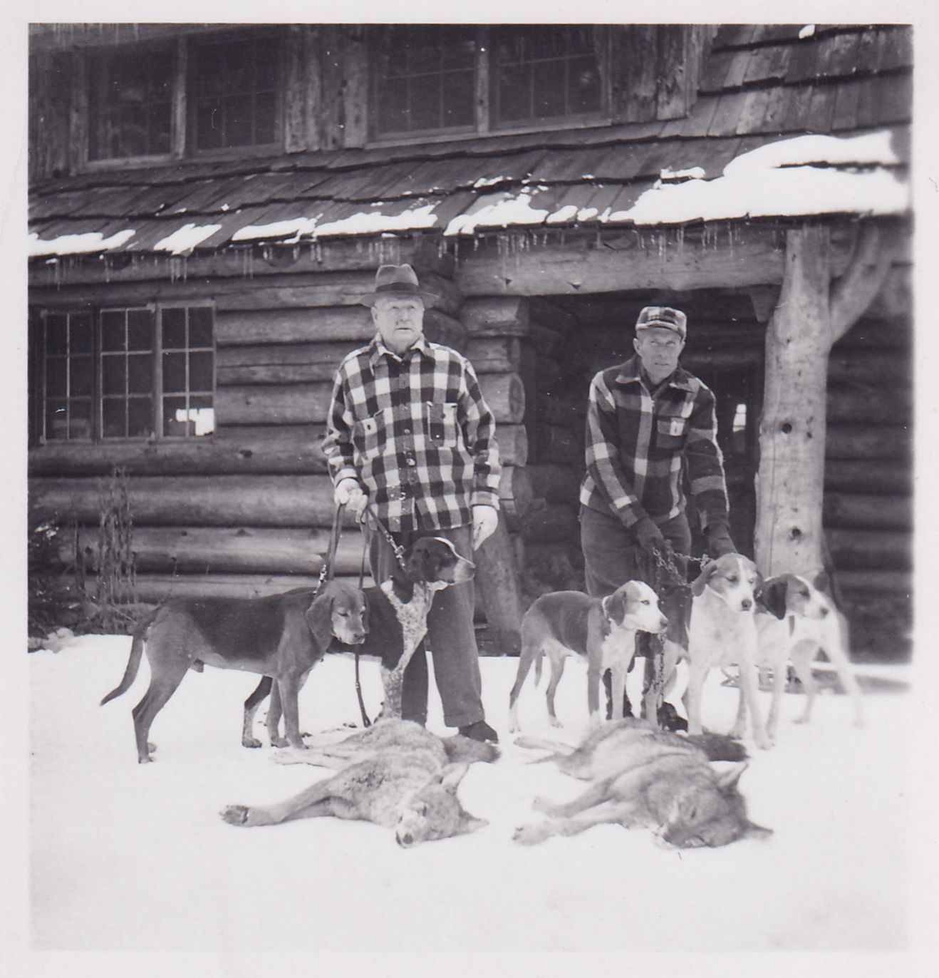Black-and-White photograph of two men standing in front of a log cabin with hunting dogs. There are two dead coyotes in the snow in front of them.