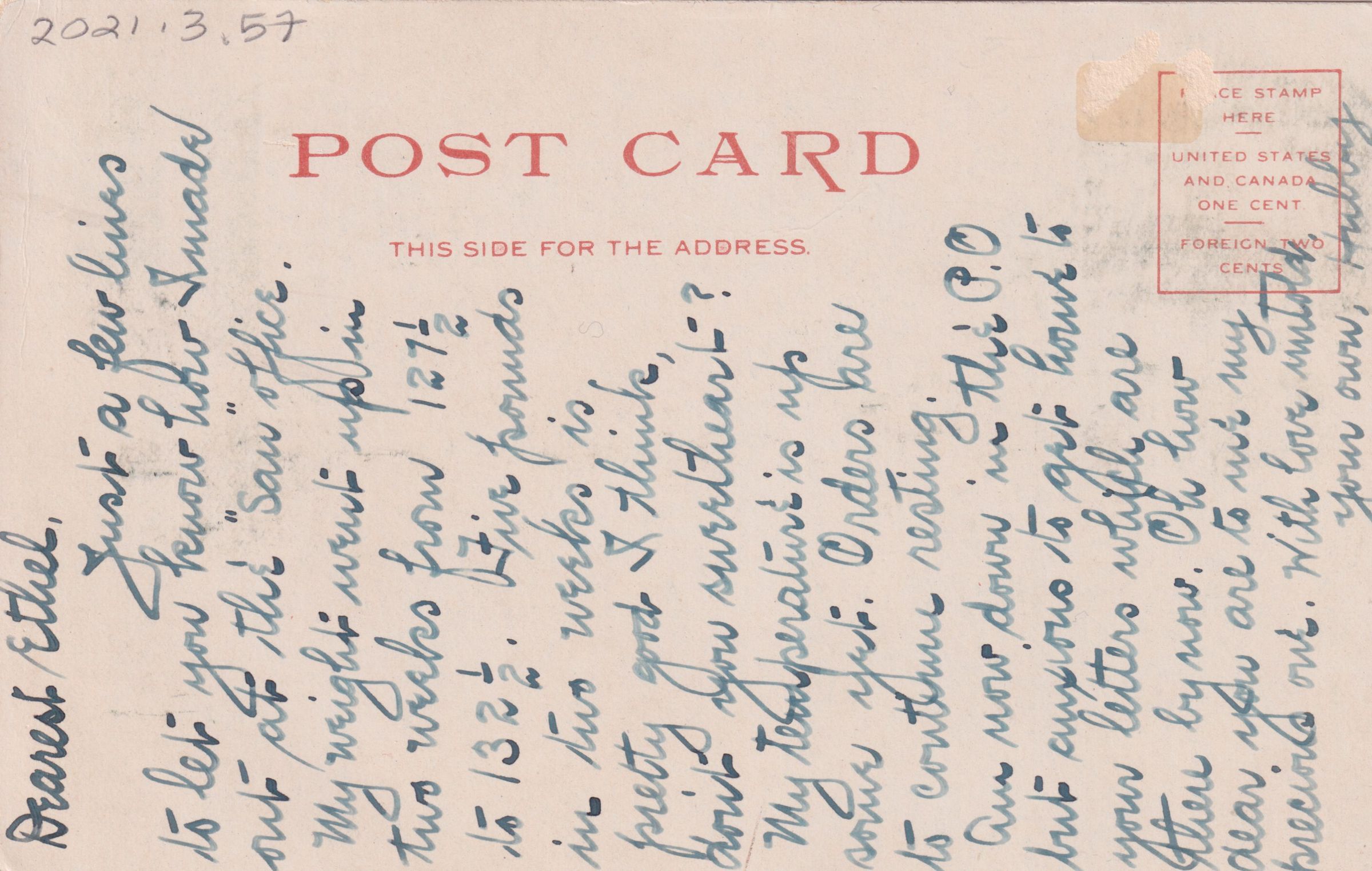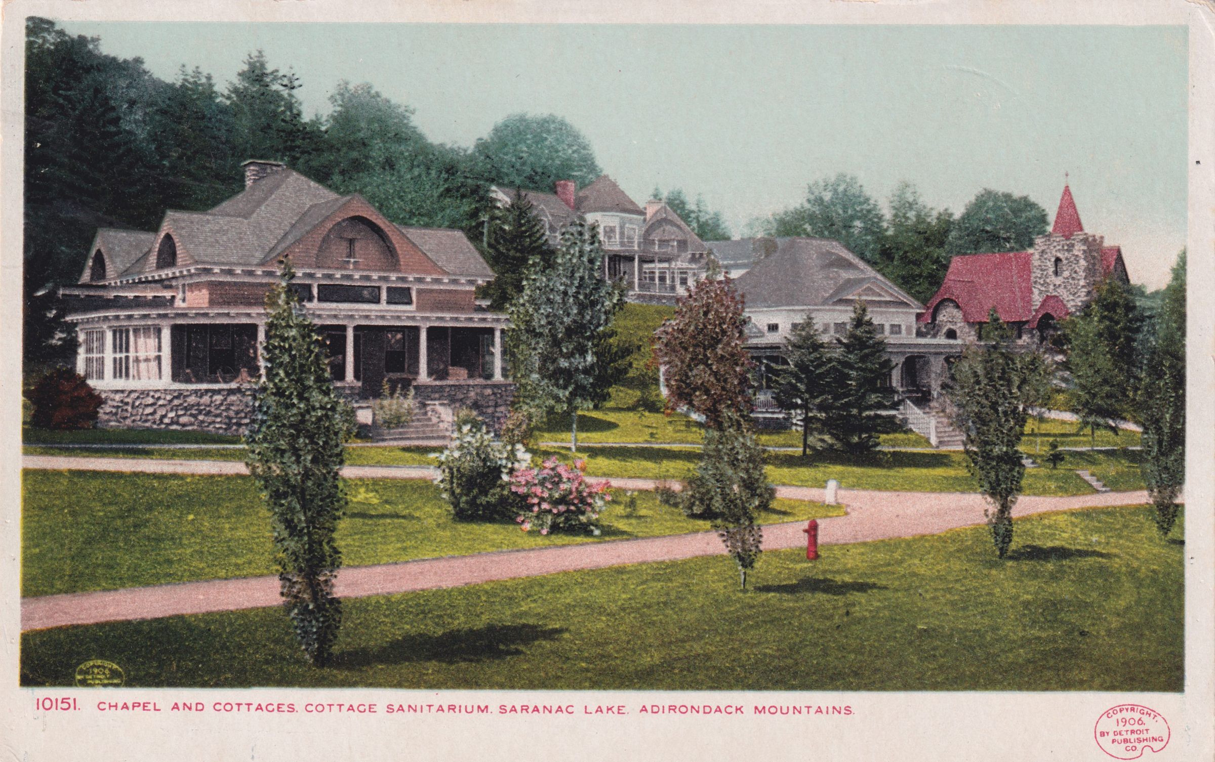 Color postcard showing cottages and chapel at the Adirondack Cottage Sanitarium [later Trudeau Sanatorium]. Ladd Cottage, Anderson Cottage, and Baker Memorial Chapel are visible with Childs Memorial Infirmary in the background. Printed caption on the front reads, "10151. Chapel and Cottages. Cottage Sanitarium. Saranac Lake. Adirondack Mountains." Used, undivided back, not postmarked. Printed by Detroit Publishing Co., copyright 1906. Handwritten message on the back reads, "Dearest Ethel, Just a few lines to let you know how I made out at the "San" office. My weight went up in two weeks from 127 1/2 to 132 1/2. Five pounds in two weeks is pretty good I think, don't you sweetheart? My temperature is up some yet. Orders are to continue resting. Am now down in the P.O. but anxious to get home to your letters which are there by now. Oh how dear you are to me my precious one. With love untold, your own, Hubby." No mailing address.Subject Place