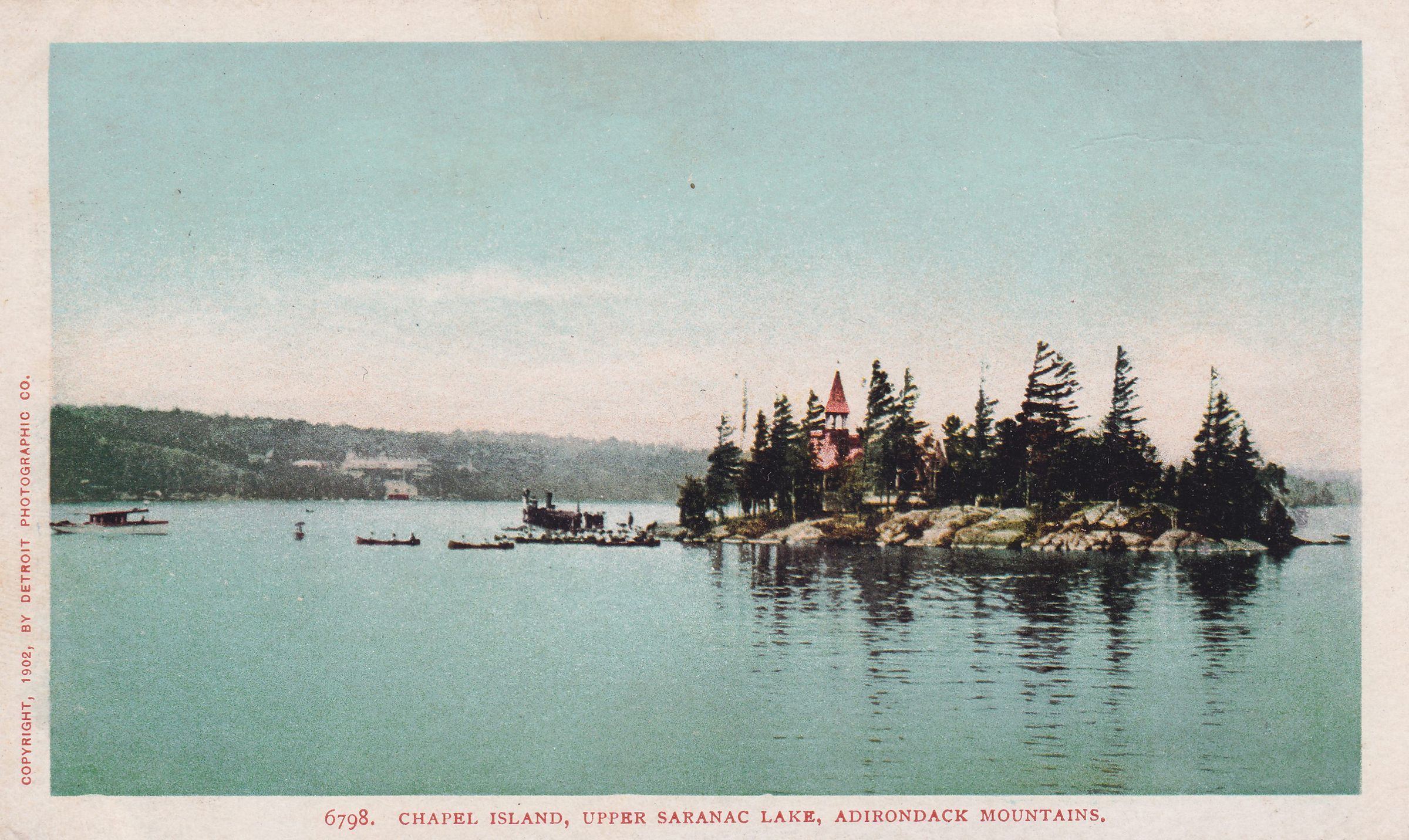 Color postcard showing boaters approaching Chapel Island. Printed caption on front reads, "Chapel Island, Upper Saranac Lake, Adirondack Mountains." Printed by Detroit Photographic Co. Unused, undivided back, white border.Subject Place
