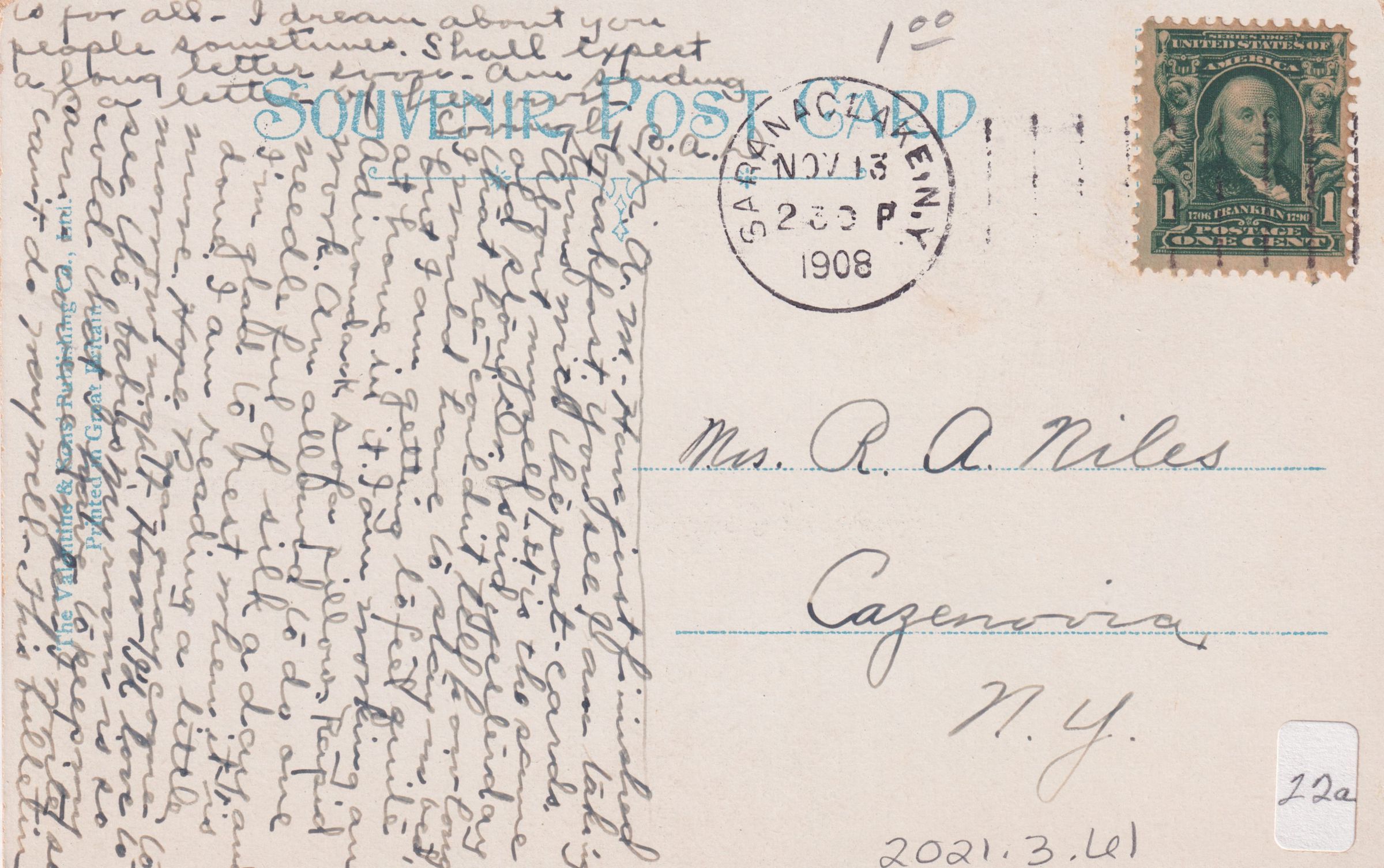 Color postcard showing an image of a brook full of logs and rocks. Printed caption on the front reads, "Cold Brook, from Old Log Dam, near Saranac Lake, N. Y." Used, divided back, postmarked November 13, 1908, Saranac Lake, NY. Printed by the Valentine & Sons' Publishing Co., Ltd. Handwritten message on the back reads, "Friday AM. Have just finished breakfast. You see I am taking turns with the post cards. About myself - It is the same old story. Dr. said yesterday that he could not tell how long I would have to stay in bed but I am getting to feel quite at home it in. I am working on Adirondack sofa pillows. Rapid work. Am allowed to do one needleful of silk a day and I am glad to rest when it is done. I am reading a little more. Hope Papa may come to see the babies. My room is so cold that I have to keep my arms covered when I write so can't do very well. This bulletin is for all - I dream about you people sometimes. Shall expect a long letter. Am sending a letter of love, Lovingly B.A.D." Mailed to Mrs. R. A. Niles, Cazenovia, N. Y.Subject Place