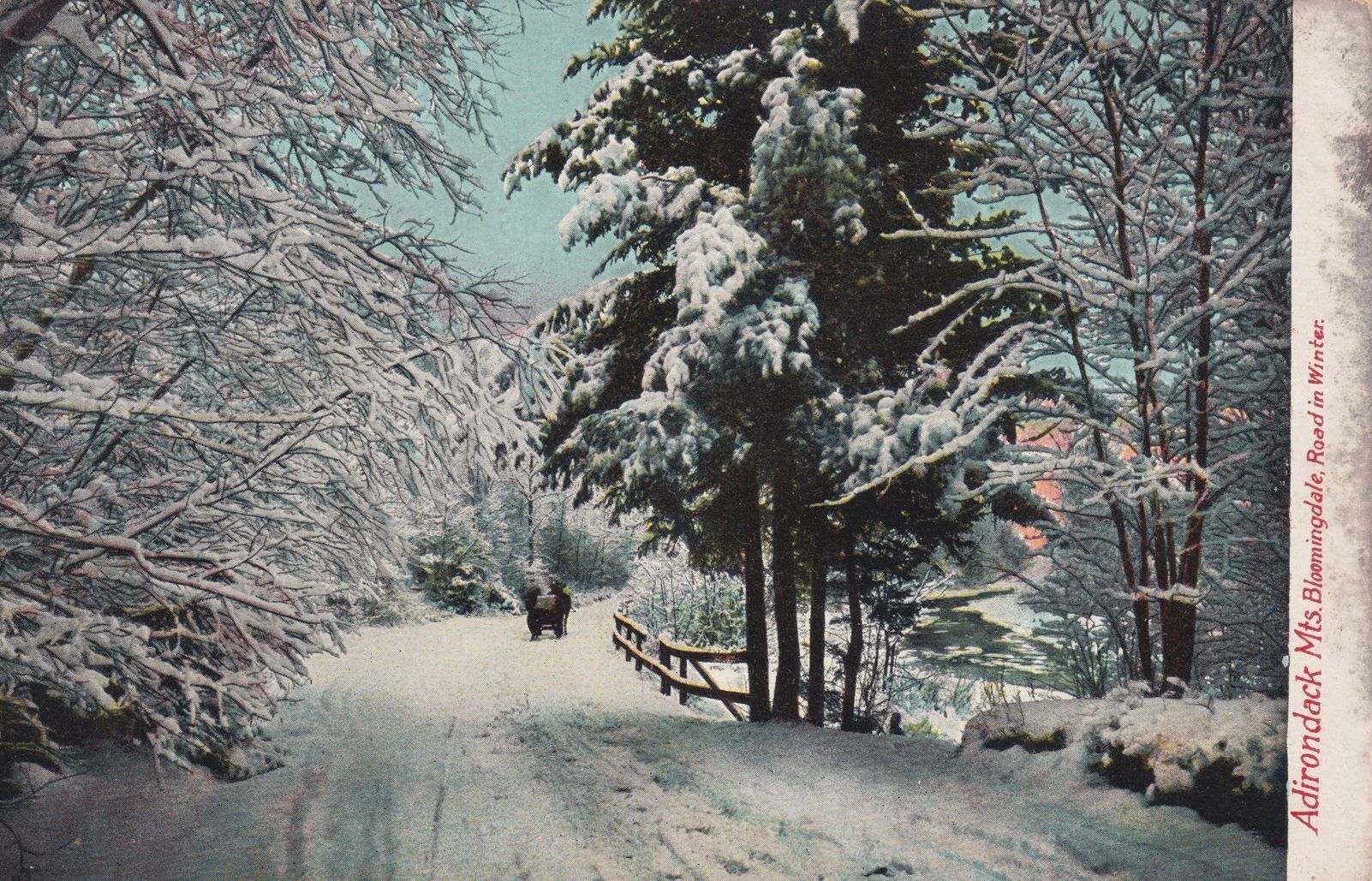 Color postcard showing Bloomingdale Avenue along the Saranac River in winter. A horse-drawn sleigh can be seen on the road. Printed caption on front reads, "Adirondack Mts., Bloomingdale, Road in Winter." Printed by the Hugh C. Leighton Co., Portland, ME. Used, divided back, postmakred Long Island City, December 4.