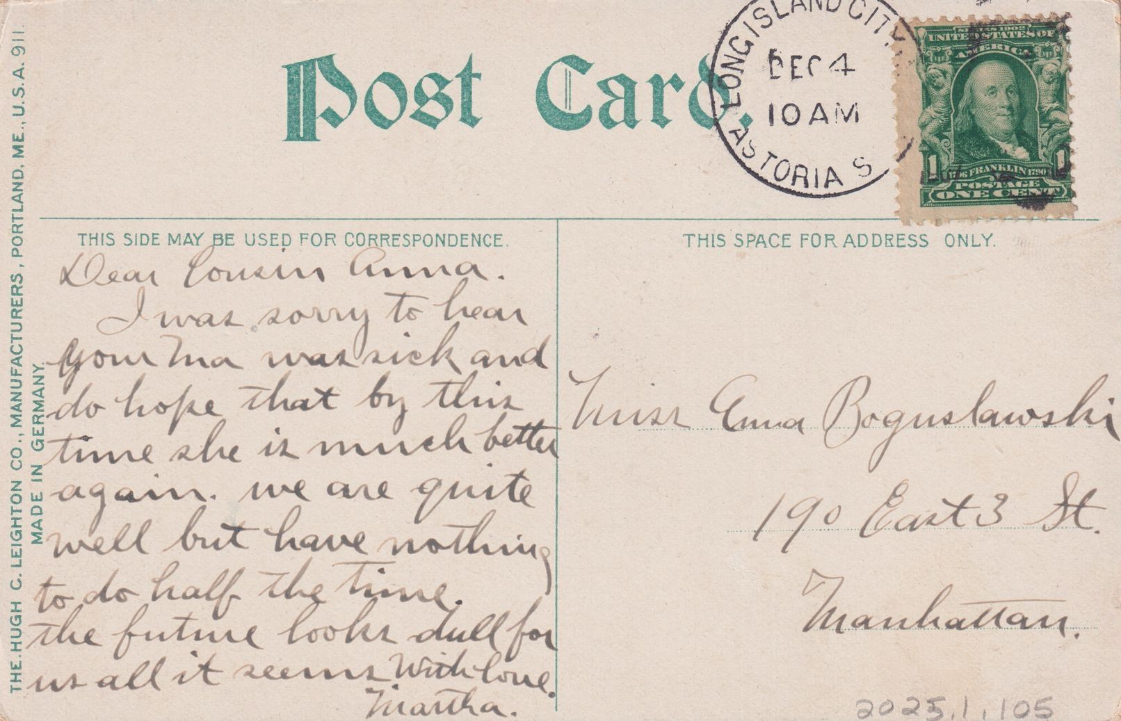 Handwritten note on reverse reads, "Dear Cousin Anna, I was sorry to hear your Ma was sick and do hope that by this time she is much better again. We are quite well but have nothing to do half the time. The future looks dull for us all it seems. With love, Martha."Subject Place