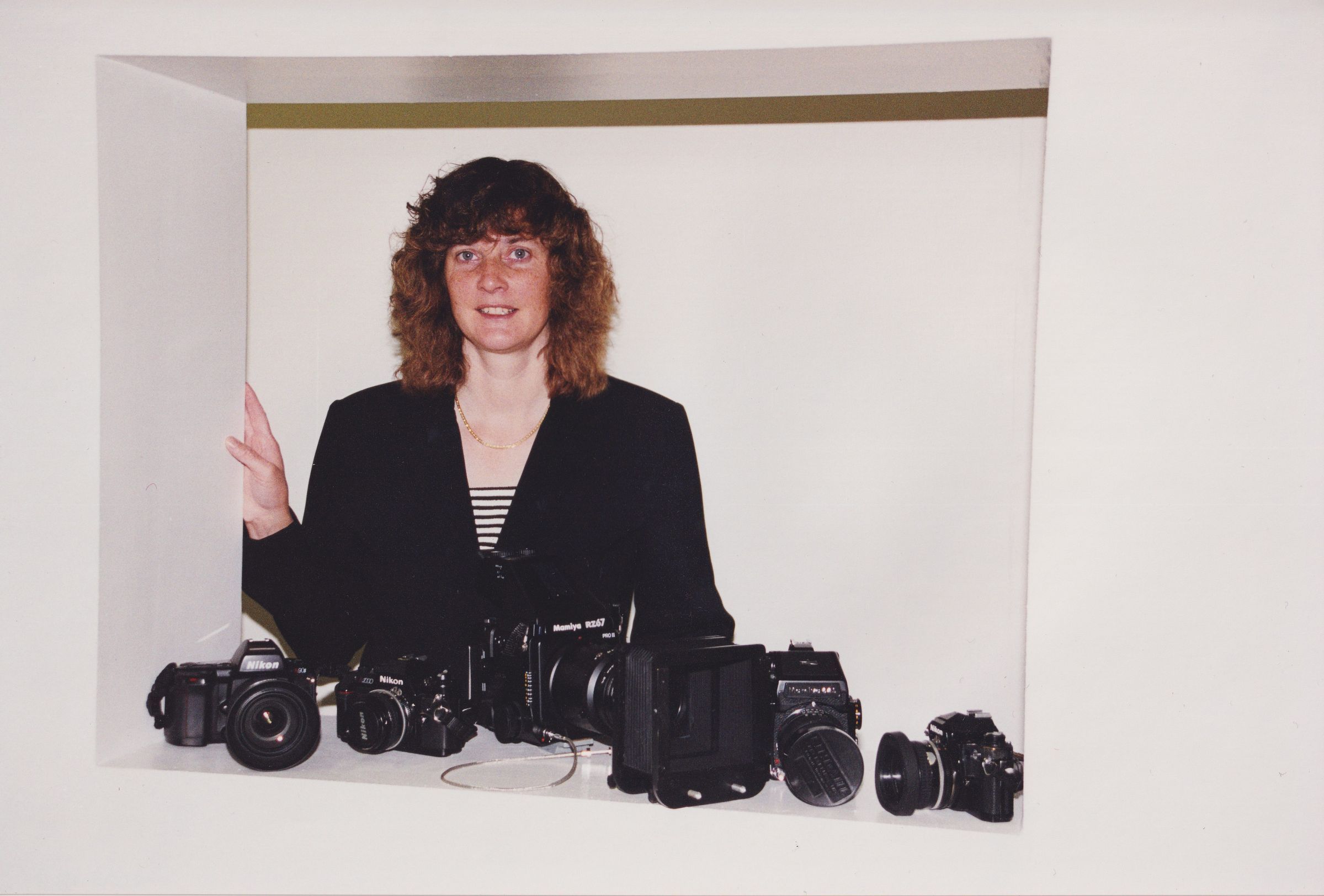 Color photograph of Alice Vera with an assortment of cameras. Alice Vera owned Alice Vera Photography. Portrait taken by Mary Lou Hanpeter Banks as part of her Soul Proprietor exhibition.