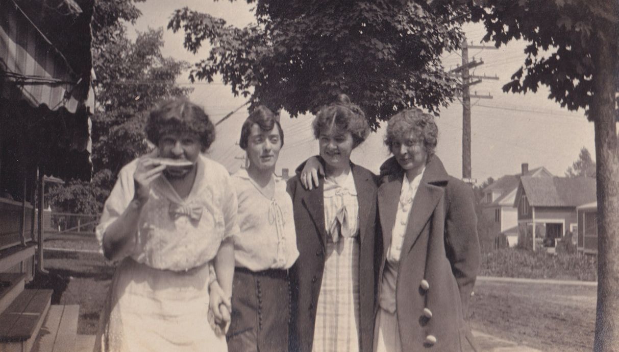 Black-and-white photograph of four women standing together in a line outside a cure cottage. The woman on the left is using one hand to eat something.