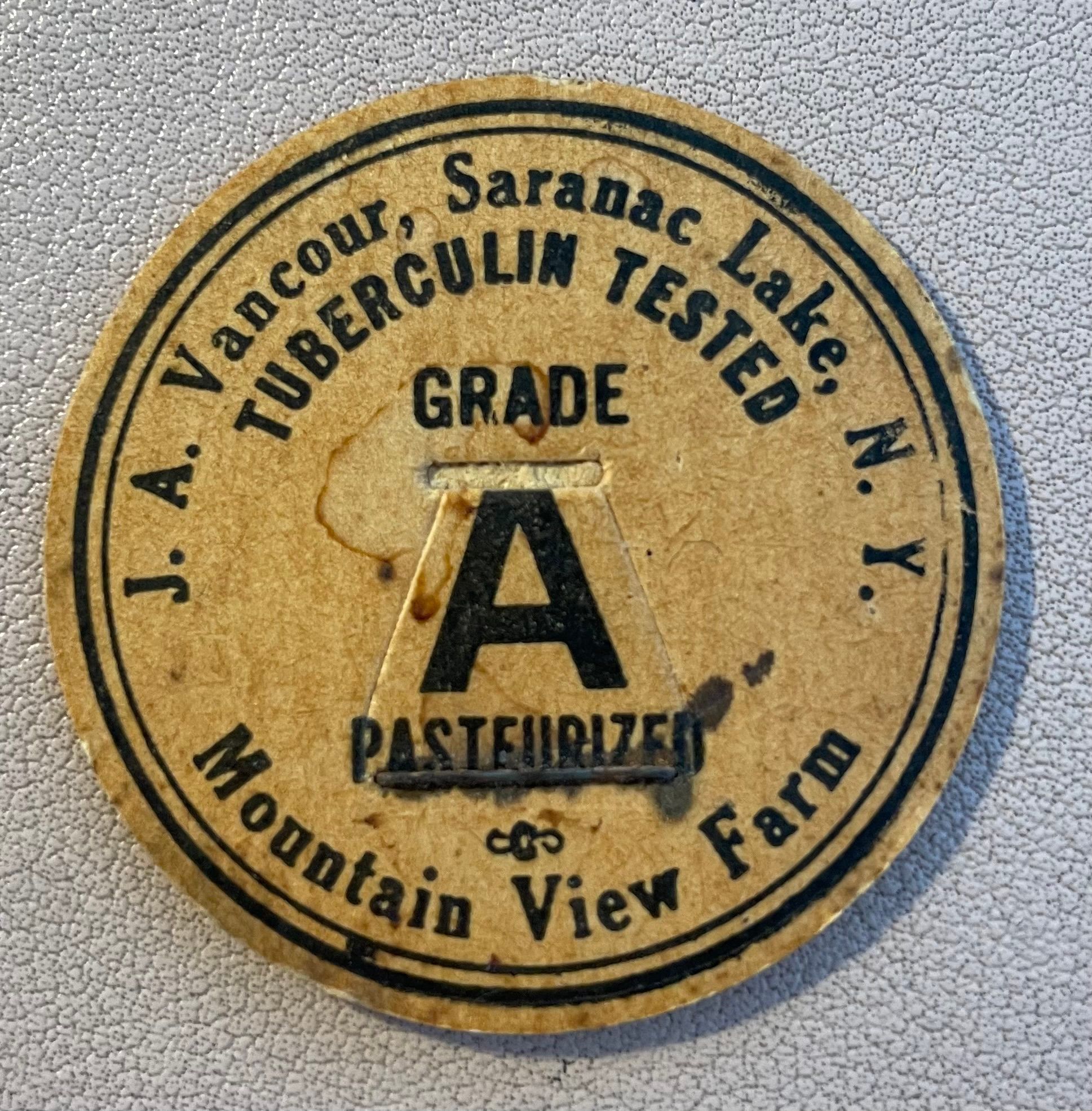 Cardboard milk bottle cap from Mountain View Farm. Printed on cap is, "J. A. Vancour, Saranac Lake, N. Y. Mountain View Farm. Tuberculin Tested, Grade A Pasteurized."