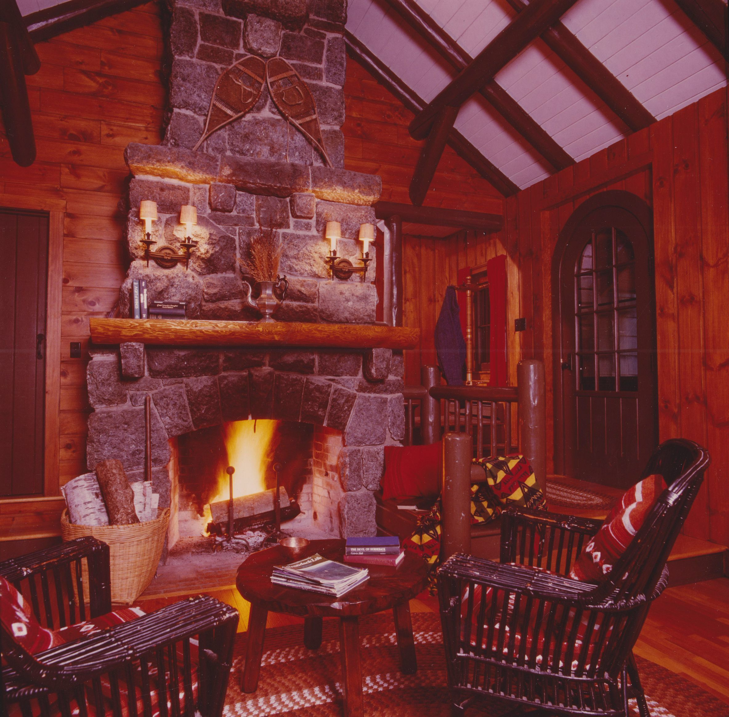 Color photograph showing a fireplace inside an unidentified cottage at Bartlett Carry Club.