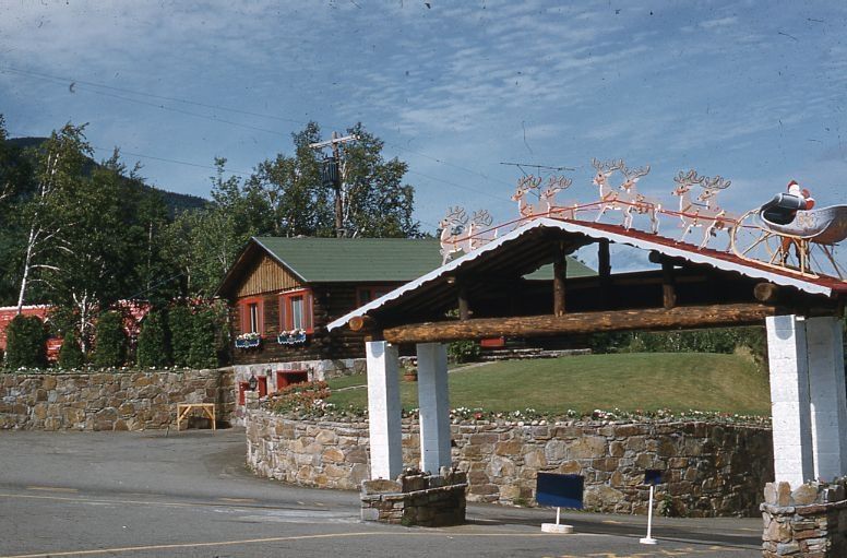 Color Kodachrome slide showing the front entrance to the North Pole in Wilmington. There is a thin, pavilion-like structure with a model of Santa Claus and reindeer on the roof. This item is not fully cataloged but has been uploaded so the image is publicly available; if you would like us to prioritize cataloging this item, please contact the HSL Collections team.
