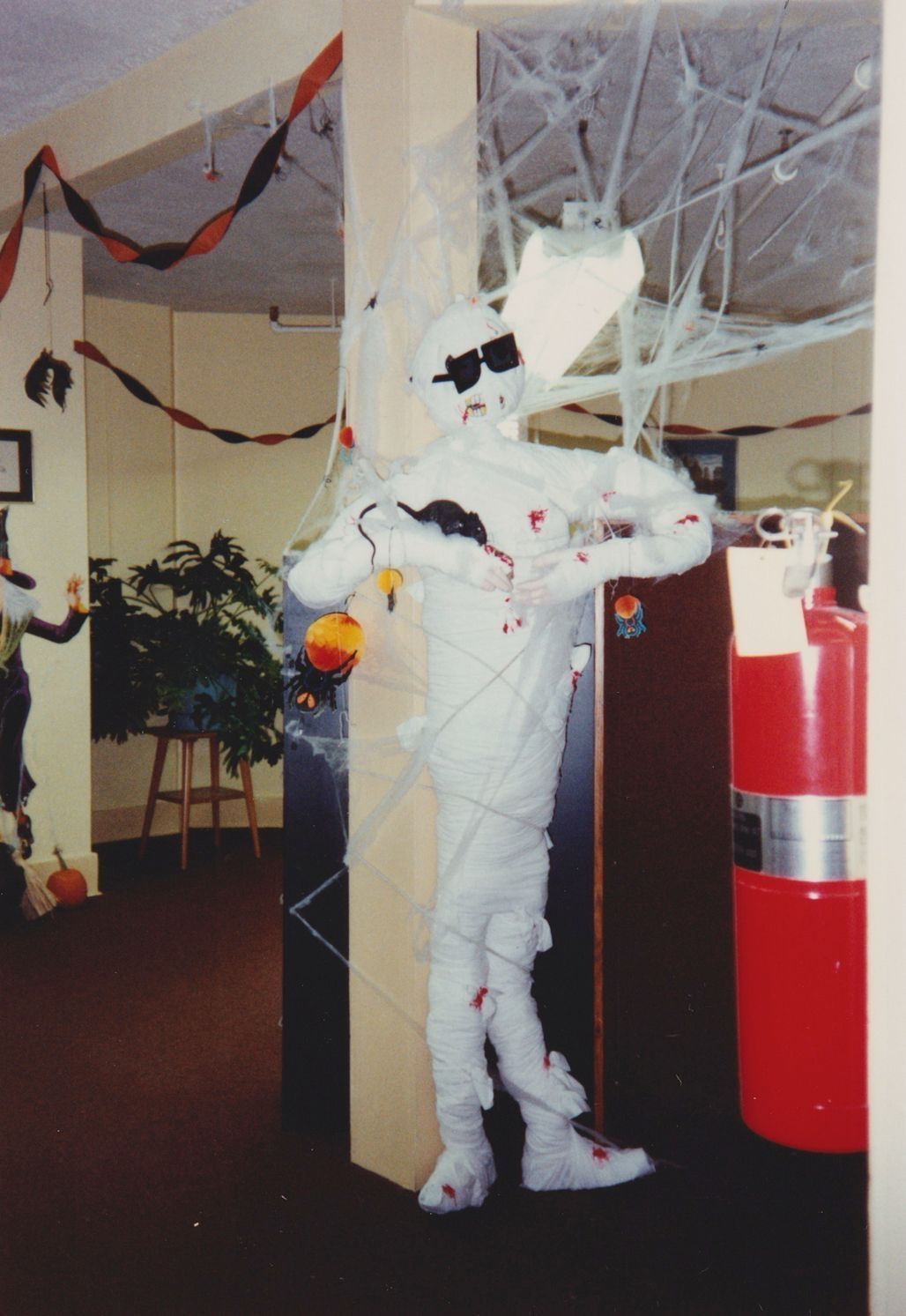 Color photograph of a fake mummy made out of toilet paper and wearing sunglasses. The mummy is attached to a support pole in the room using fake spider web.This photograph is from an album of photographs taken at the American Management Association.