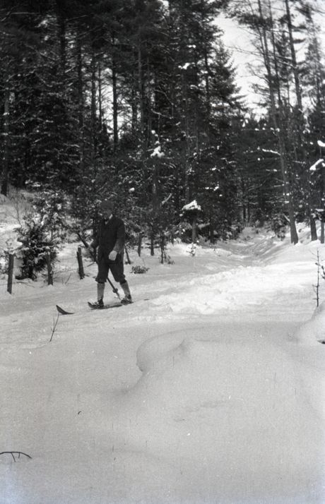Negative of an unidentified man wearing skis on a forested trail. Most likely taken by Mary Ives Baldwin. This item is not fully cataloged but has been uploaded so the image is publicly available; if you would like us to prioritize cataloging this item, please contact the HSL Collections team.