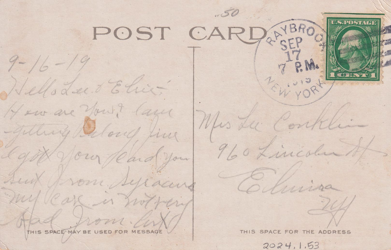 Color postcard showing waterfalls. Printed caption on front reads, "Rainbow and Horse Shoe Falls, Ausable Chasm, Adirondacks, N. Y." No printer's mark. Used, divided back, white border, postmarked Ray Brook, NY, September 17, 1919. Handwritten message on back reads, "9-16-19. Hello Lee & Elise [?] - How are you? I am getting along fine. I got your card you sent from Syracuse. My case is not very bad. From [?]." Mailed to Mrs. Lee Conklin, 960 Lincoln St., Elmira, NY.Lexicon