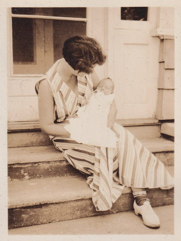 Black-and-White photograph of Amy Jones cradling baby Lucy Jones. She is seated on the steps of the family's second home in Saranac Lake, possibly 453 Lake Street. Part of album 2024.21.1, kept by Amy Jones and David Blair Jones c. 1930-1934.