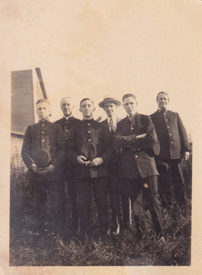 Black-and-White photograph of a group of six unidentified men standing outdoors. Four of the men are wearing military or other uniforms. The photograph was likely printed by Kollecker's Kodak and Gift Shop.