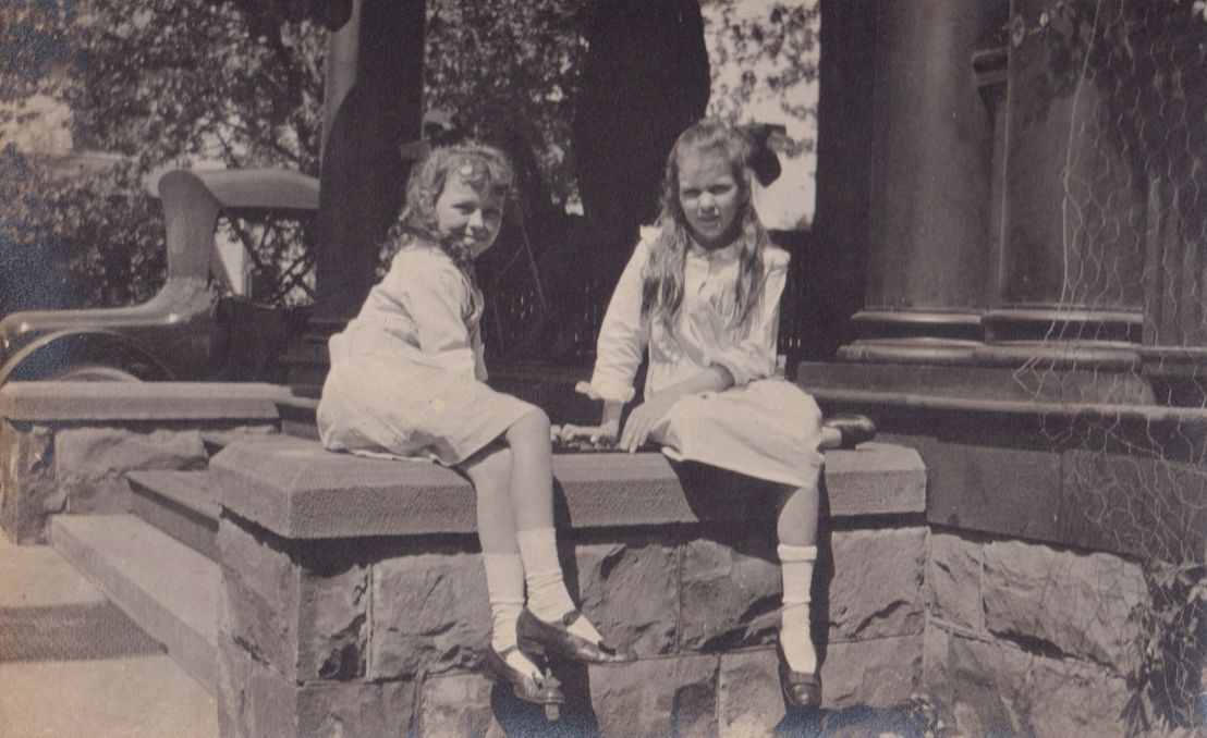 Black-and-white photograph of two girls sitting on a short stone wall next to the front steps of a house. There is a car parked next to the house visible in the background of the photo.