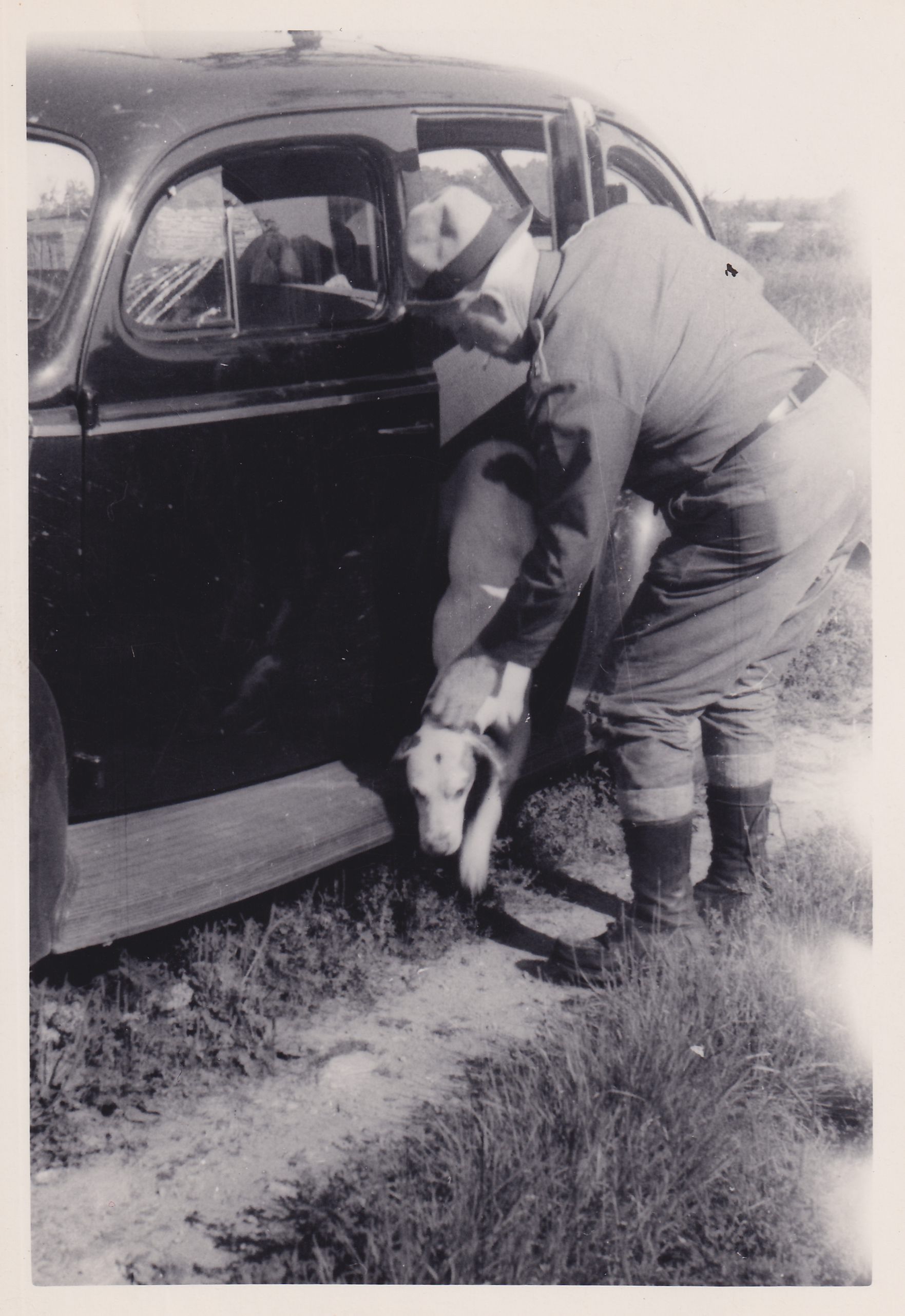 Black-and-White photograph of Ray Burmaster letting a hunting dog out of the back seat of a car.