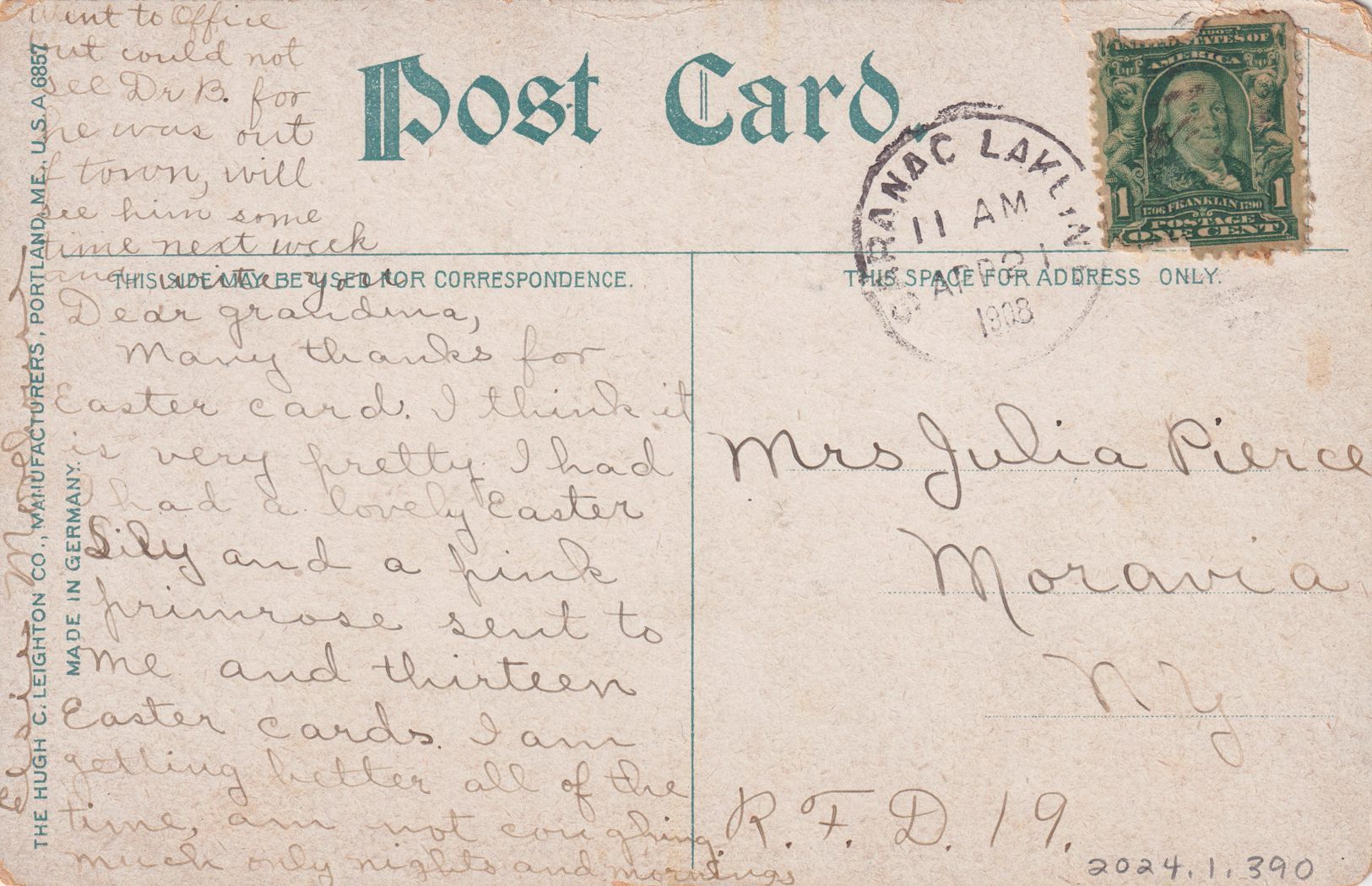Postcard with an illustration of the Administration Building at Trudeau Sanatorium. The postcard is addressed to Mrs. Julia Pierce.