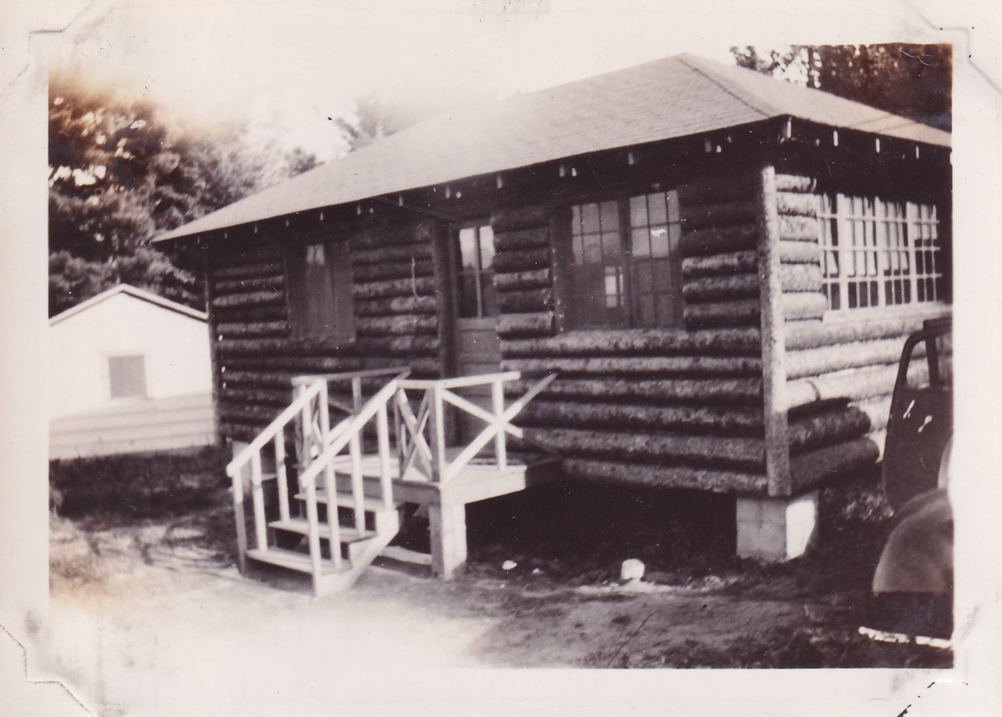 Black-and-white photograph showing a small log cabin, likely in Saranac Lake. White border, no markings.