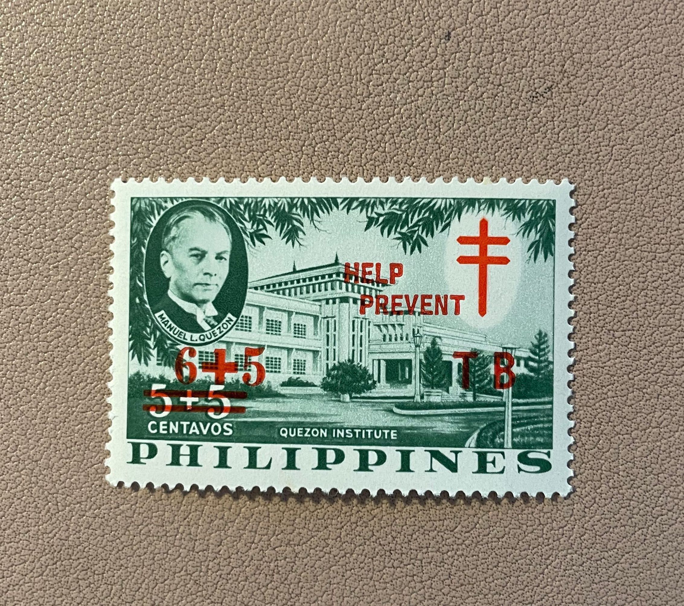 Filipino postage stamp with image of the Quezon Institute and inset image of President Manuel L. Quezon. Stamps are printed in green tone with red ink reading "Help prevent TB," and double-barred cross.