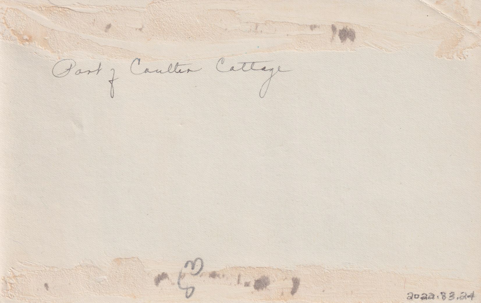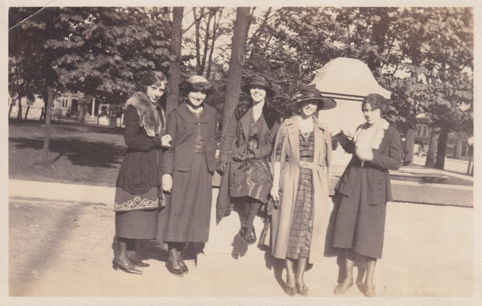 Black-and-White photograph of a group of five women standing near what appears to be a park. There is a monument or fountain visible behind them. Handwritten note on reverse reads, "Part of Coulter Cottage."