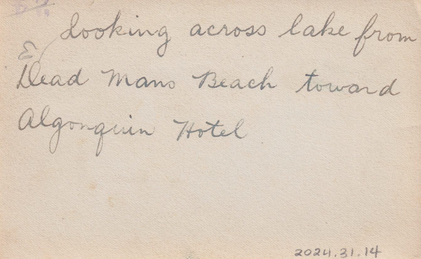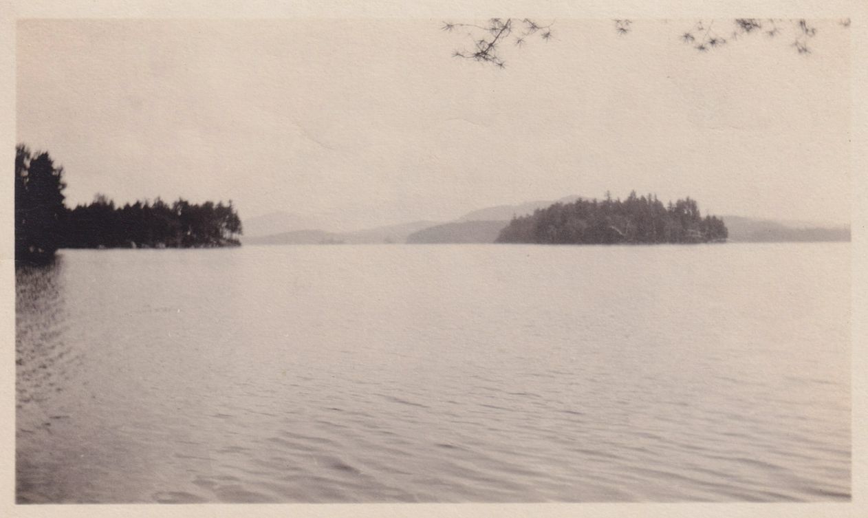 Black-and-White photograph looking across Lower Saranac Lake. Handwritten caption on reverse reads, "Looking across lake from Dead Mans Beach toward Algonquin Hotel." Taken by Harvey Harrison Bird while curing in Saranac Lake, 1920-1921.