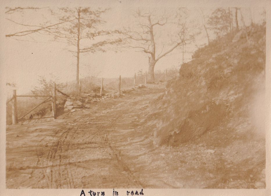 Black-and-white photograph of a dirt road curving around a rocky incline. There is a fence on one side of the road. "A turn in road" is written in ink beneath the photograph.