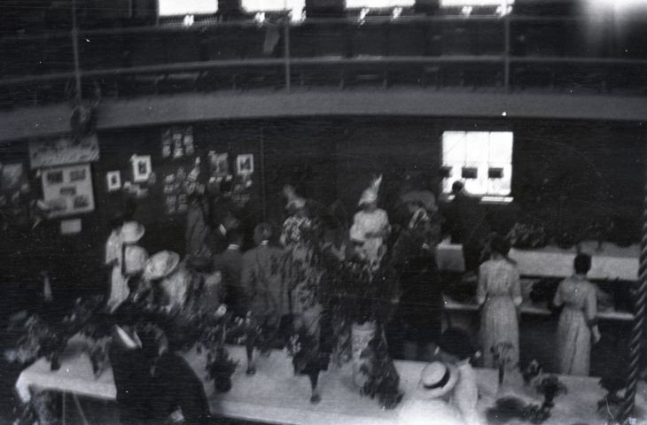 Negative of a cafeteria during Halloween. There appear to be many bouquets on the table and people are wearing costumes. Most likely taken by Mary Ives Baldwin. This item is not fully cataloged but has been uploaded so the image is publicly available; if you would like us to prioritize cataloging this item, please contact the HSL Collections team.