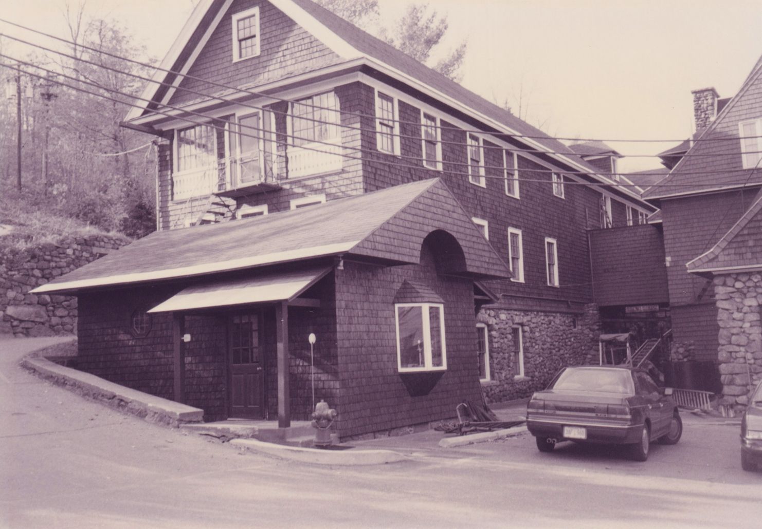 Black-and-white photograph of a brown building with a road running around it. The building was the Kahnweiler Library when it was part of the Trudeau Sanatorium, but at the time of the photograph it was part of the American Management Association grounds.
