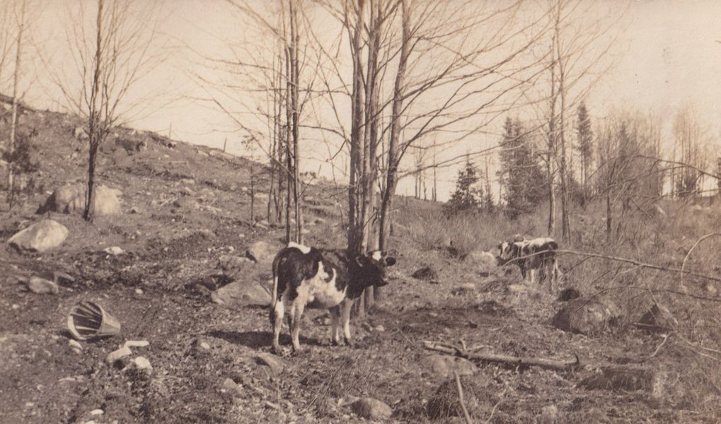 Black-and-white photograph of two cows on the side of a hill with little growth besides brush and a few barren trees. There is a lamp shade or wooden basket on the ground near one of the cows.