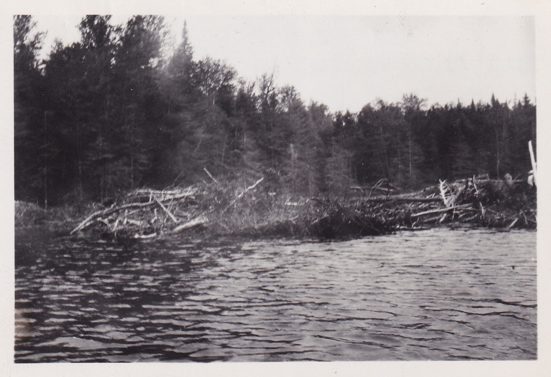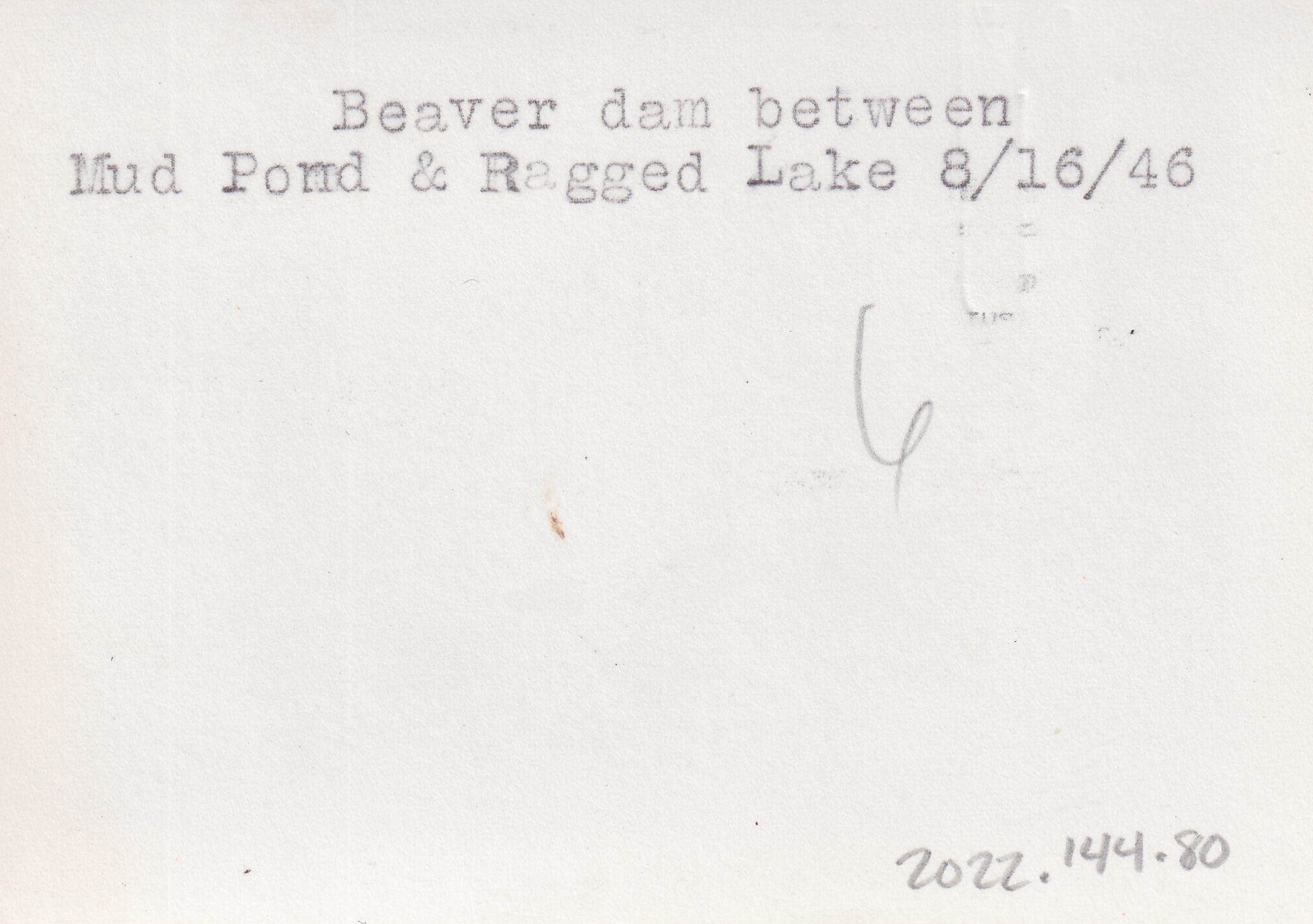 Black-and-White photograph of a beaver dam on a body of water. Typewritten caption on back reads, "Beaver Dam Between Mud Pond & Ragged Lake. 8/16/46."