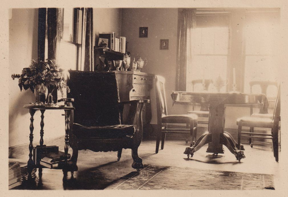 Black-and-White photograph of the interior of the second residence of the Jones Family in Saranac Lake, an unidentified cure cottage on Lake Street. It may be 453 Lake Street. The cottage was rented furnished.