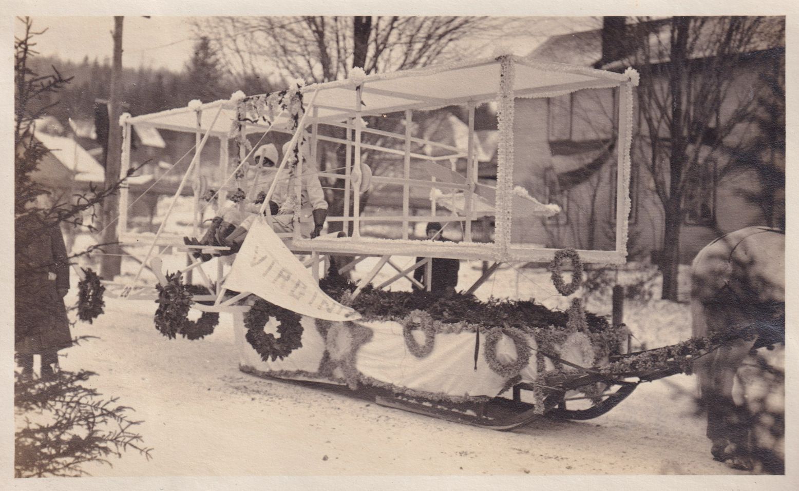 Black-and-white photograph of a Winter Carnival float shaped like a biplane. There is a flag that says "Virigina" hanging from the plane, and two women sitting on the float.