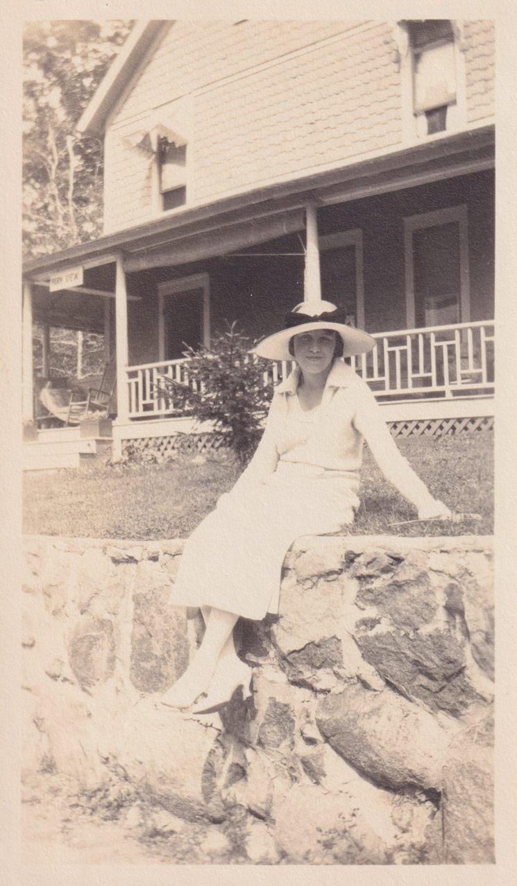 Black-and-White photograph of an unidentified woman seated on a stone wall in front of a house. There is a sign above the front steps of the house that reads, "Park View." The photograph was likely printed by Kollecker's Kodak and Gift Shop.