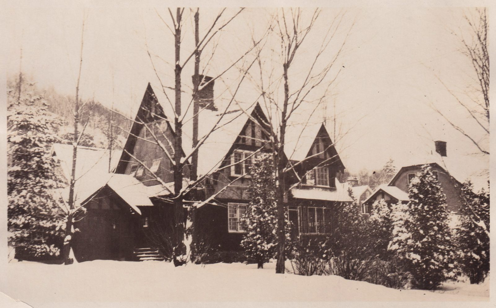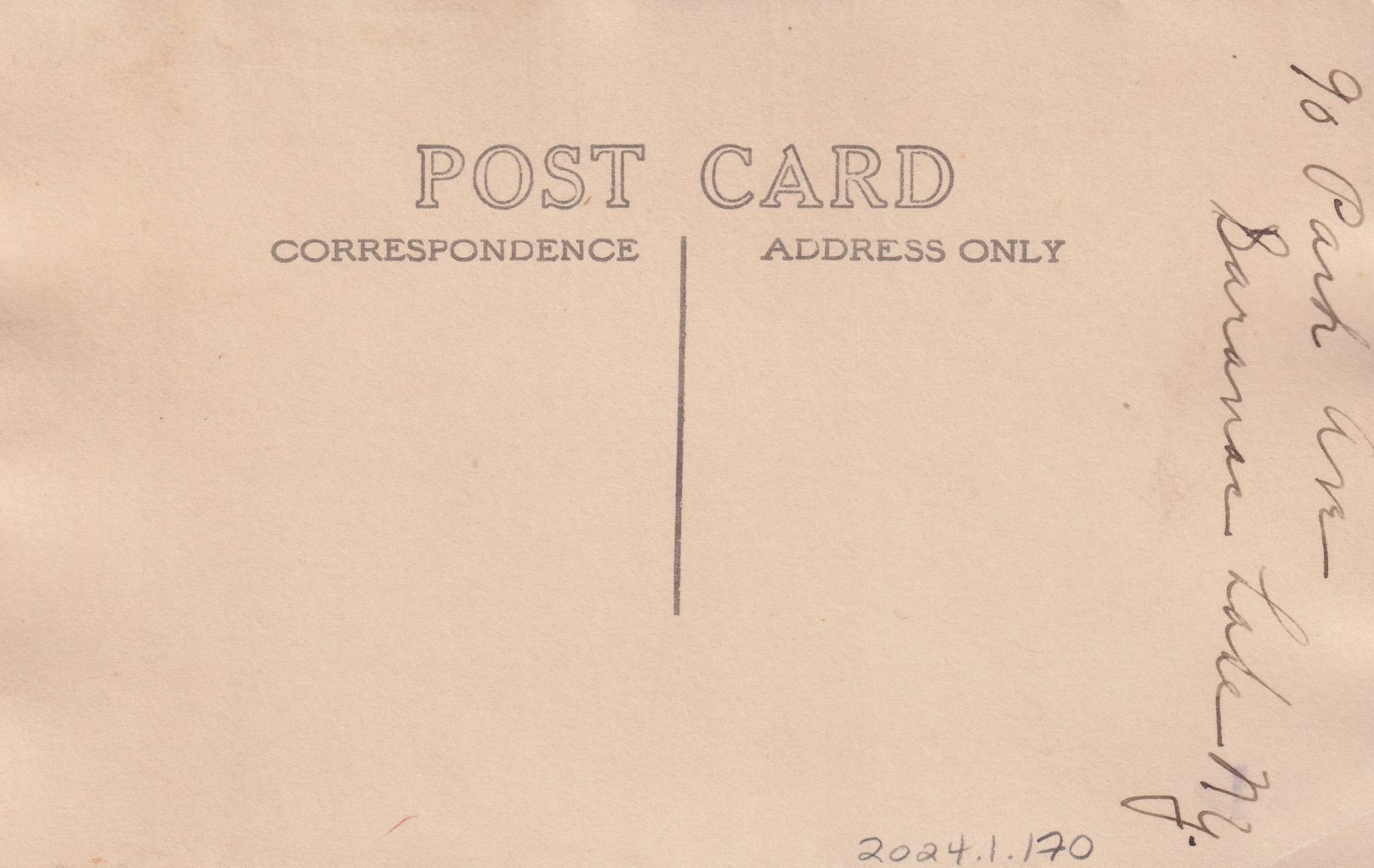 Black-and-White photograph postcard showing the Feustmann Cottage, formerly 90 Park Avenue, now 185 Park Avenue, in the snow. Handwritten caption on reverse reads, "90 Park Ave., Saranac Lake, N.Y." No photographer's mark. Unused, divided back, white border.Subject Place