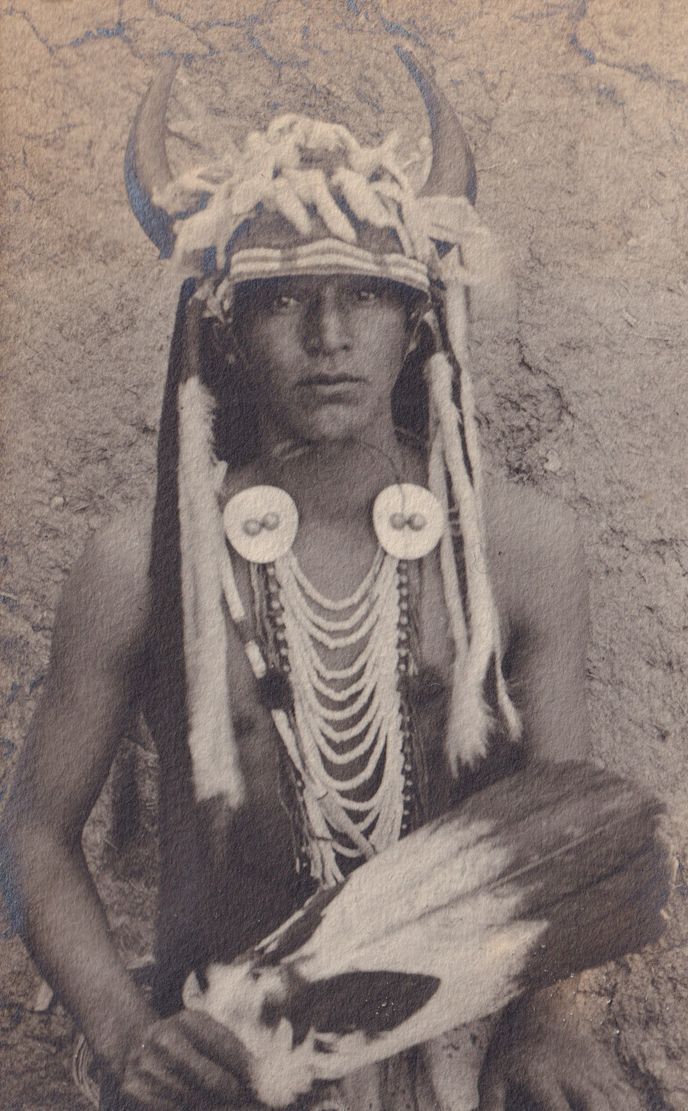 Black-and-white photograph of a young man wearing Native regalia and standing in front of a rock wall.