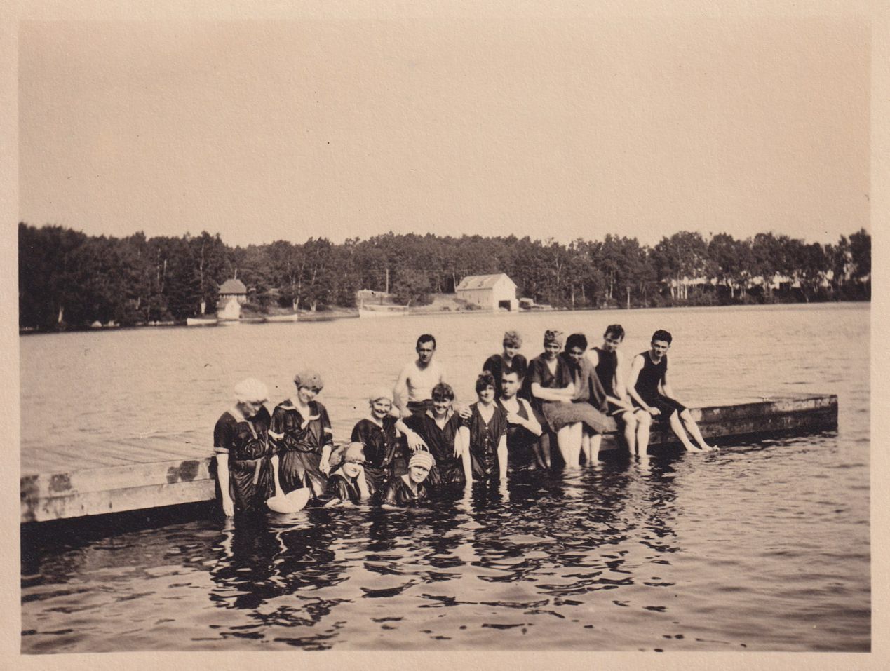 Black-and-White photograph of a group of people in bathing costumes seated on a dock on an unidentified body of water. The photograph was likely printed by Kollecker's Kodak and Gift Shop.