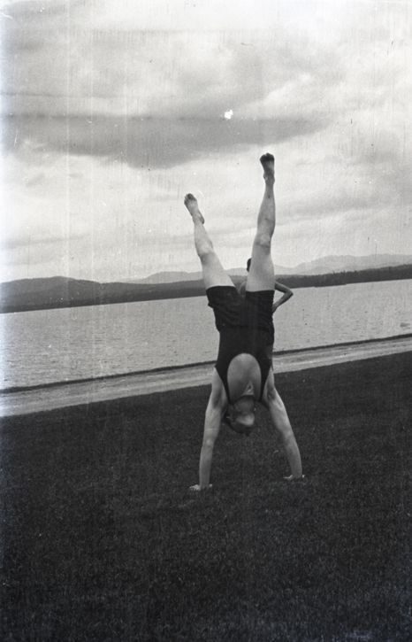 Negative of a unidentified young man doing a handstand near the shore of a lake. He is wearing a bathing suit. Most likely taken by Henry Ives Baldwin. This item is not fully cataloged but has been uploaded so the image is publicly available; if you would like us to prioritize cataloging this item, please contact the HSL Collections team.