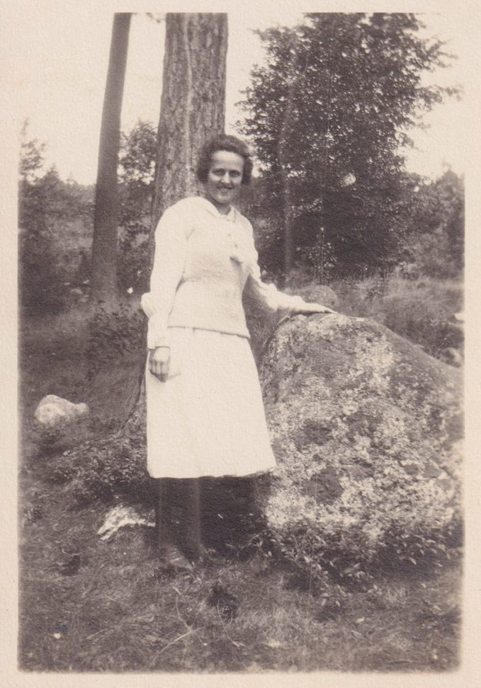 Black-and-White photograph of an unidentified woman standing next to a rock. The photograph was likely printed by Kollecker's Kodak and Gift Shop.