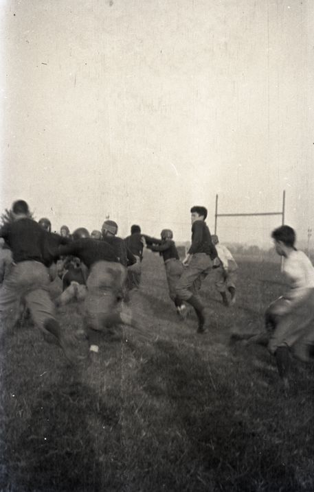 Negative of a football game, taken from behind the line of one team as they approach the other. Most likely taken by Mary Ives Baldwin. This item is not fully cataloged but has been uploaded so the image is publicly available; if you would like us to prioritize cataloging this item, please contact the HSL Collections team.