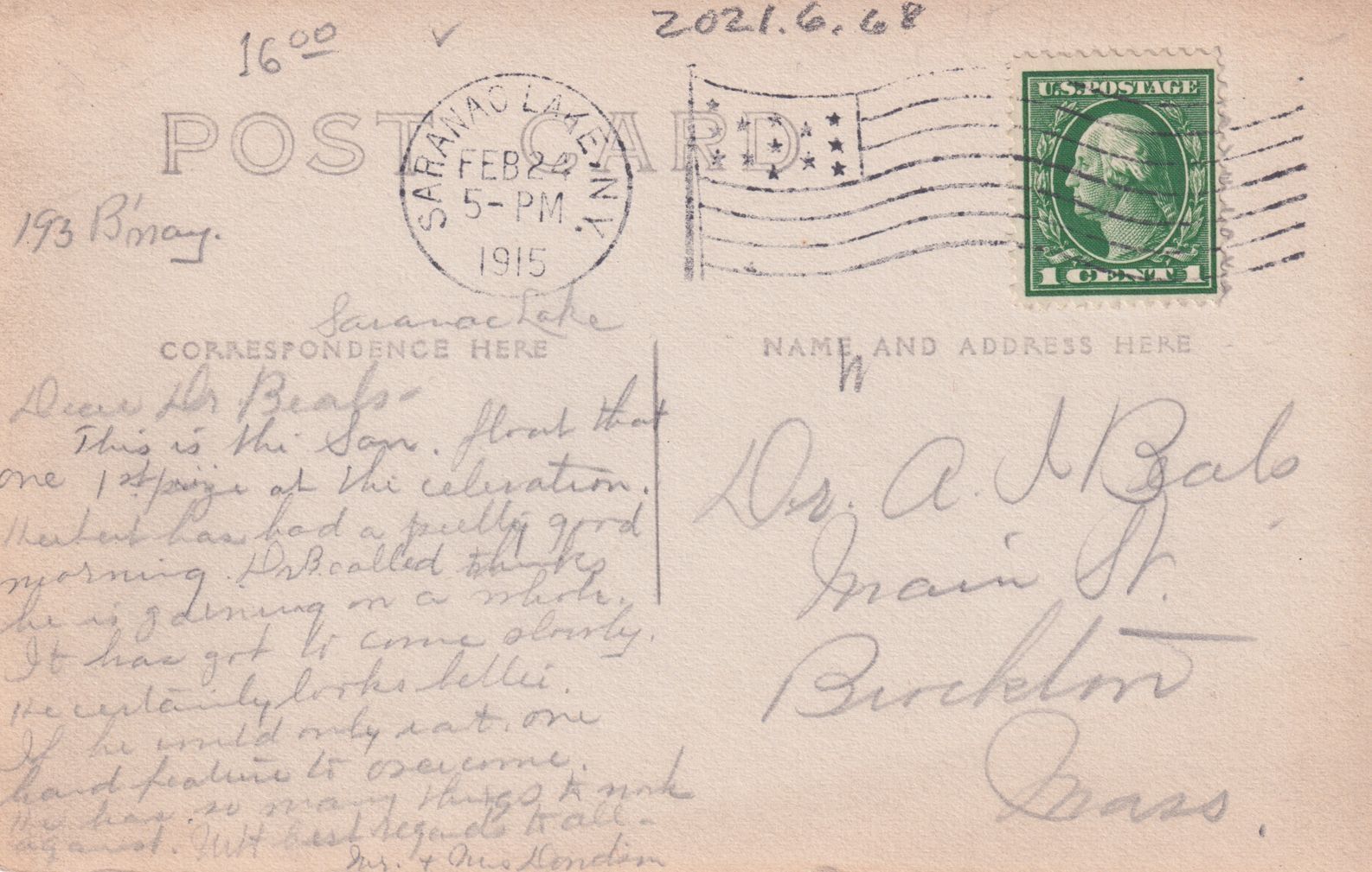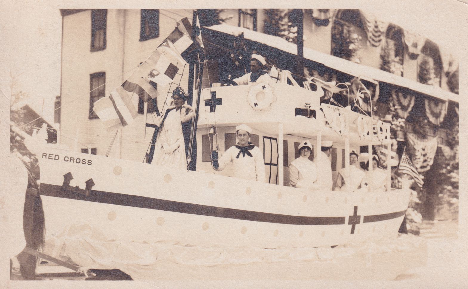 Black and white photo postcard of a winter carnival float shaped like a boat with the name "Red Cross" painted on the stern. There are nurses and others standing on the float. The reverse of the postcard has a long handwritten message in pencil on one side, with the addressee on the other, "Dr. [I?] Beals Main St. [?] Mass."