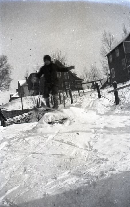Negative of a young man using a snow ramp as a ski jump. Likely Henry Ives Baldwin. Most likely taken by Mary Ives Baldwin. This item is not fully cataloged but has been uploaded so the image is publicly available; if you would like us to prioritize cataloging this item, please contact the HSL Collections team.