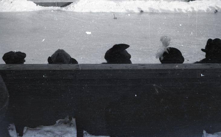 Negative of the Pontiac Bay ice rink, taken from behind a line of spectators. Most likely taken by Mary Ives Baldwin. This item is not fully cataloged but has been uploaded so the image is publicly available; if you would like us to prioritize cataloging this item, please contact the HSL Collections team.