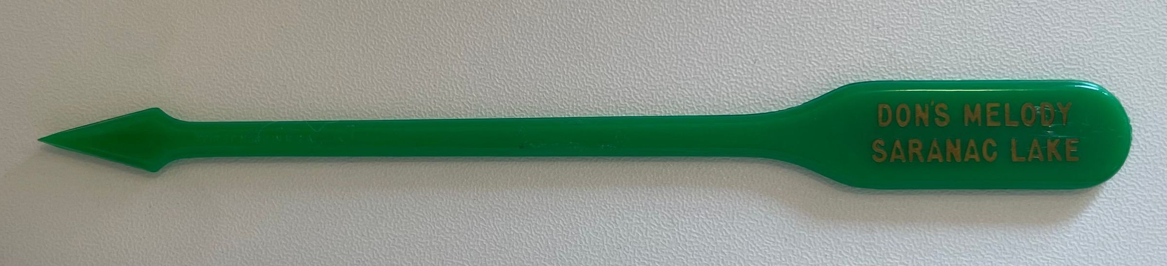 Green plastic swizzle stick with a pointed tip. Printed in gold lettering is, "Don's Melody, Saranac Lake."