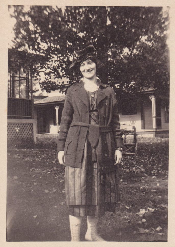 Black-and-White photograph of an unidentified woman standing outdoors. Two houses can be seen behind her. The photograph was likely printed by Kollecker's Kodak and Gift Shop.