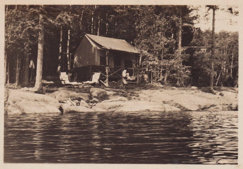 Black-and-White photograph of a state campsite seen from the water. A platform tent can be seen on the site. Part of album 2024.21.1, kept by Amy Jones and David Blair Jones c. 1930-1934.