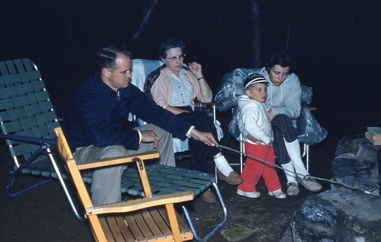Color Kodachrome slide showing three people and a toddler in camp chairs. This item is not fully cataloged but has been uploaded so the image is publicly available; if you would like us to prioritize cataloging this item, please contact the HSL Collections team.