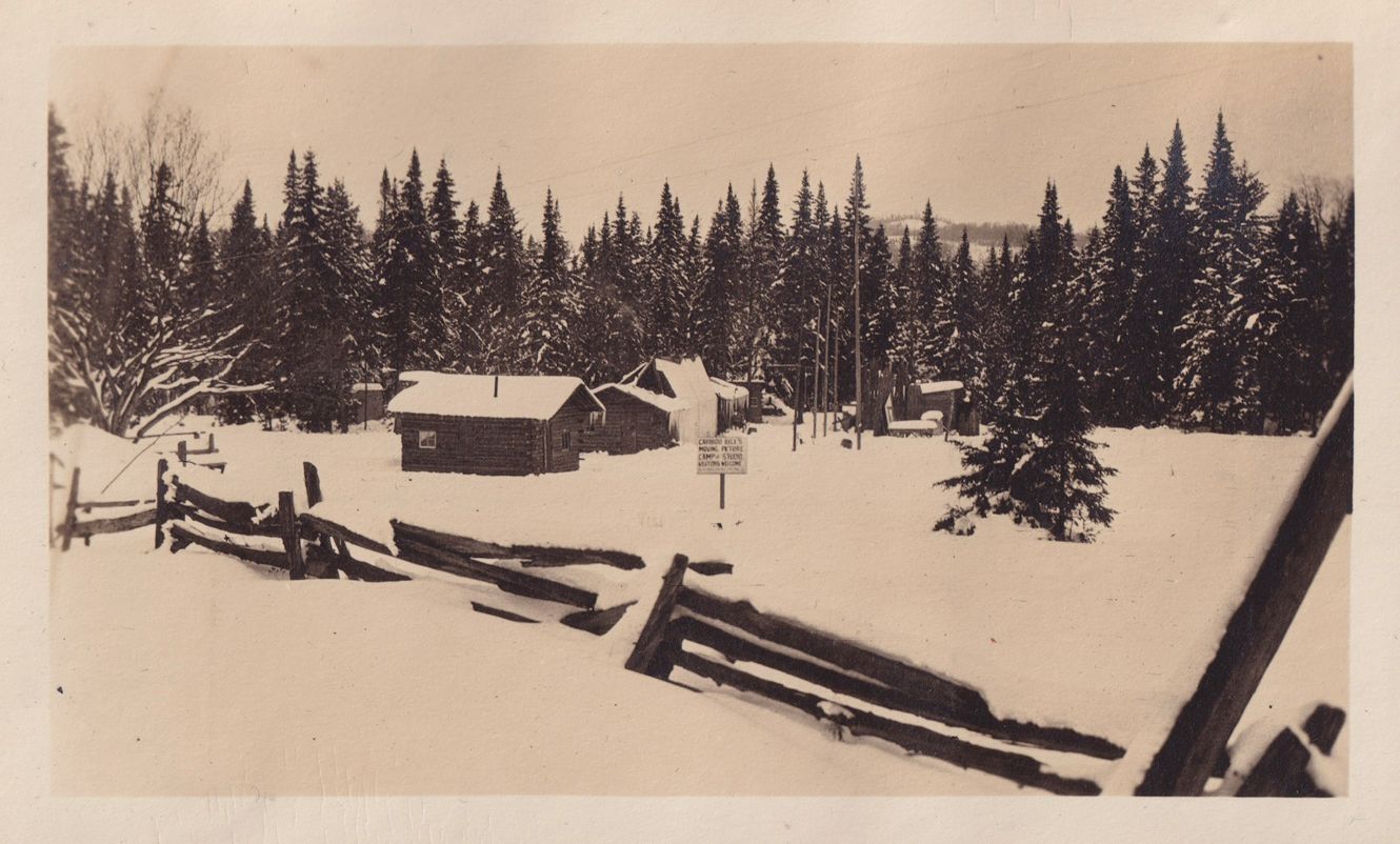 Black-and-white photograph of a snow-covered filmset. There is a partially collapsed wooden fence and a handful of small buildings all covered in snow, with a snowy pine forest behind them. There is also a sign that says, "Caribou Bill's Moving Picture Camp & Studio Visitors Welcome."