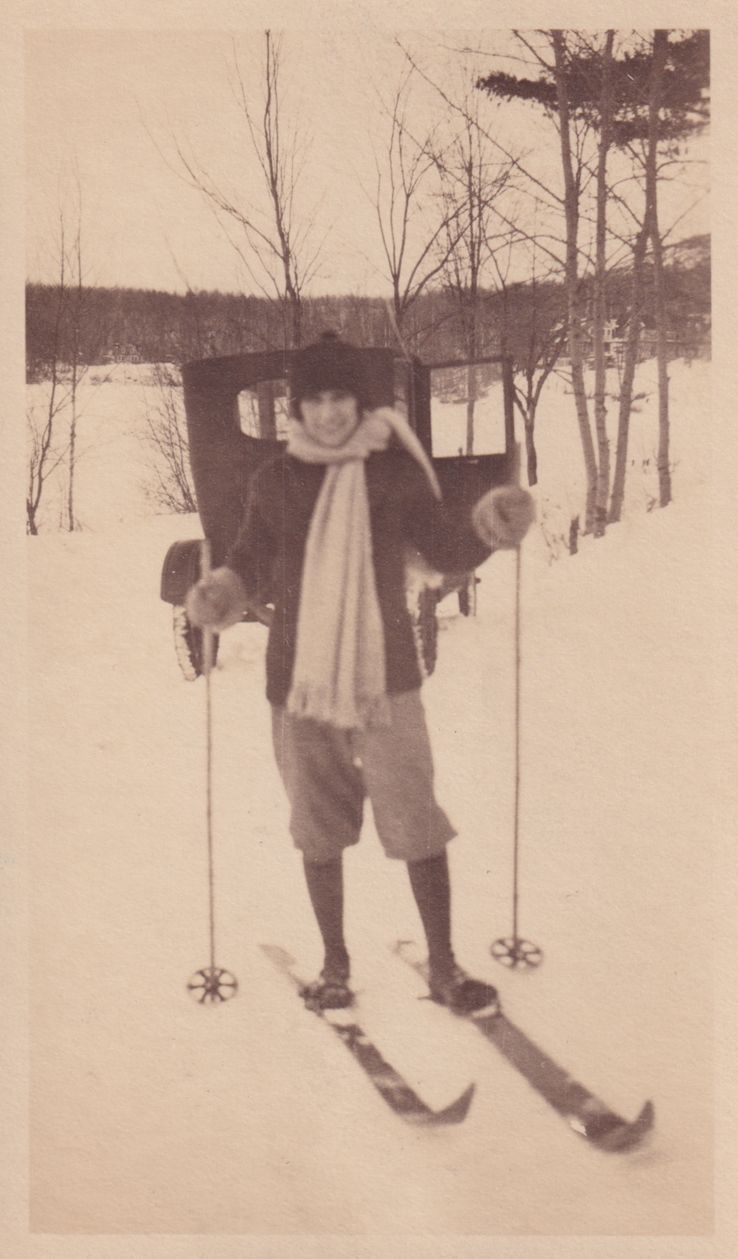 Black and white photograph of a woman in winter attire on skis. She is standing on snowy ground with a parked car behind her. A large house or camp can be seen through the trees to the right of the woman. This item is not fully cataloged but has been uploaded so the image is publicly available; if you would like us to prioritize cataloging this item, please contact the HSL Collections team.