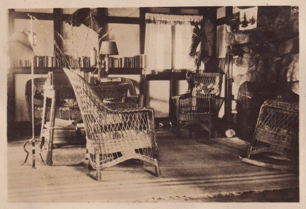 Black-and-White photograph of the living room of Danforth Cottage. Part of album 2024.21.1, kept by Amy Jones and David Blair Jones c. 1930-1934.